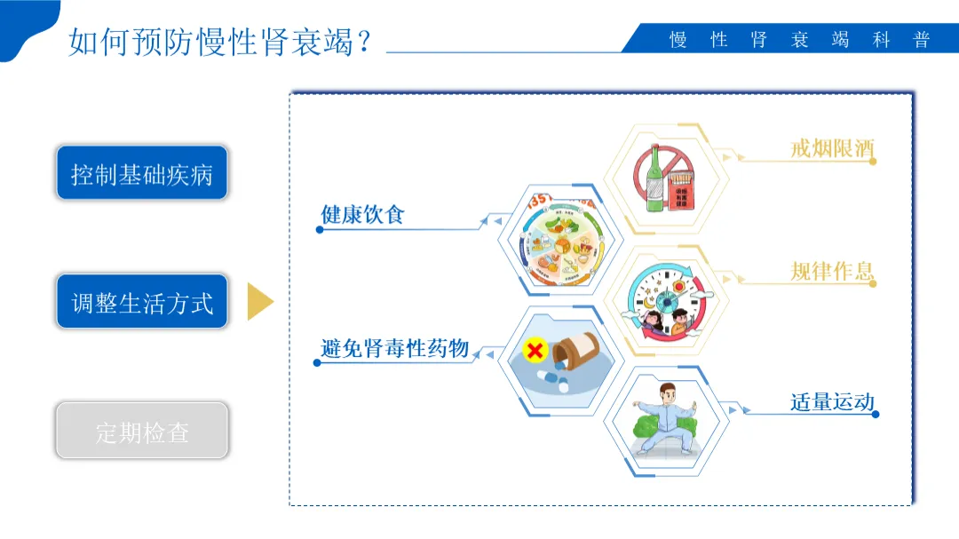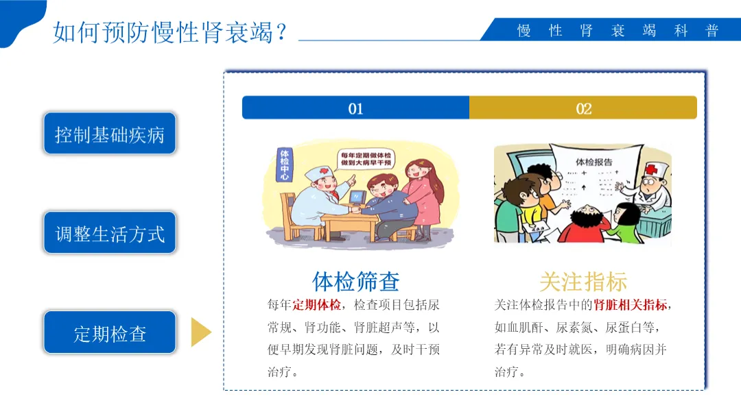 预防,永远比治疗更重要。我们可以从三个方面做起:第一,调整生活方式。低盐低脂饮食、适量饮水、不憋尿、不滥用药物、戒烟限酒、规律作息——这些看似简单的事,是对肾脏最温柔的呵护。第二,控制基础疾病。高血压、糖尿病患者,请一定把血压和血糖控制在理想范围。控制好原发病,就是保护肾脏最有效的手段。第三,定期检查。每年定期体检,项目包括尿常规、肾功能、肾脏超声等,才能早期发现肾脏问题,及时干预。关注体检报告中的肾脏相关指标:血肌酐、尿素氮、尿蛋白……如果出现异常,请不要忽视,及时就医,明确病因,尽早治疗。