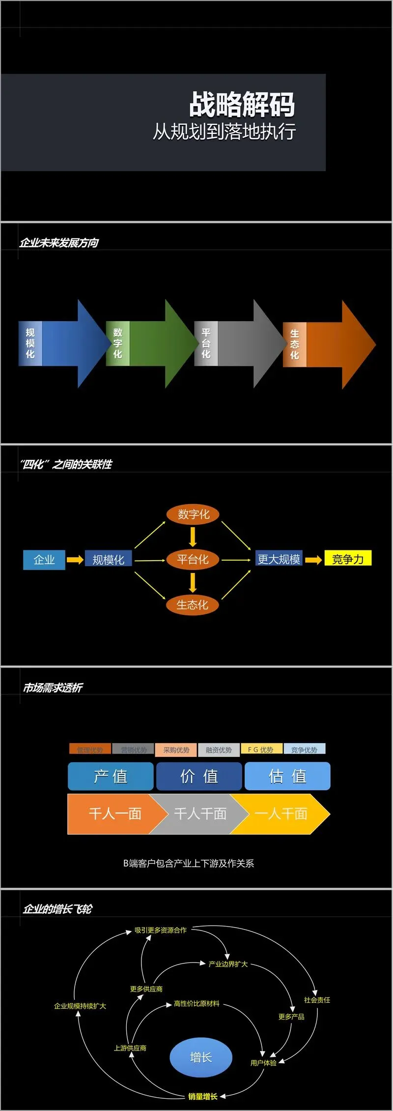 企业未来发展聚焦生态化、平台化、数字化、规模化四大方向,这 “四化” 相互关联、层层递进。数字化是基础支撑,通过技术赋能优化运营效率;平台化搭建资源整合载体,链接产业上下游;生态化拓展产业边界,构建协同发展网络;规模化则实现企业规模与竞争力的同步提升,最终形成企业增长飞轮。在市场需求层面,资料强调要透析产值、价值、估值三大核心维度,把握从 “千人一面” 到 “一人千面” 的需求升级趋势,依托管理、营销、采购等多方面竞争优势,链接 B 端产业上下游及合作关系,实现可持续增长。