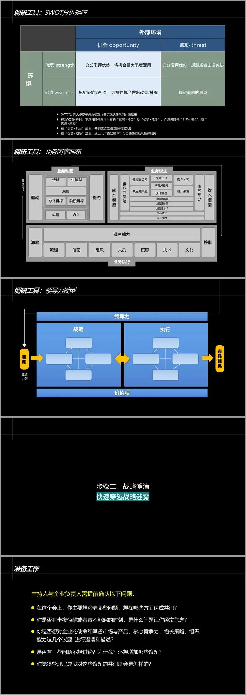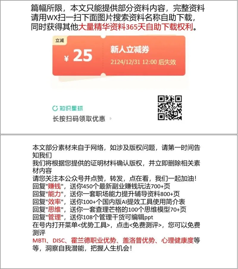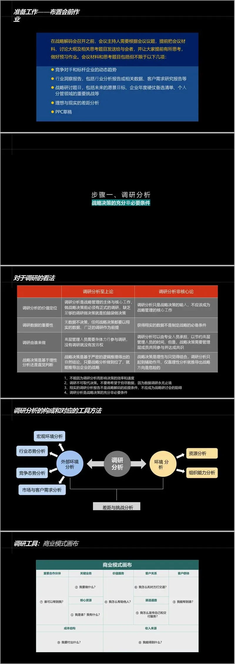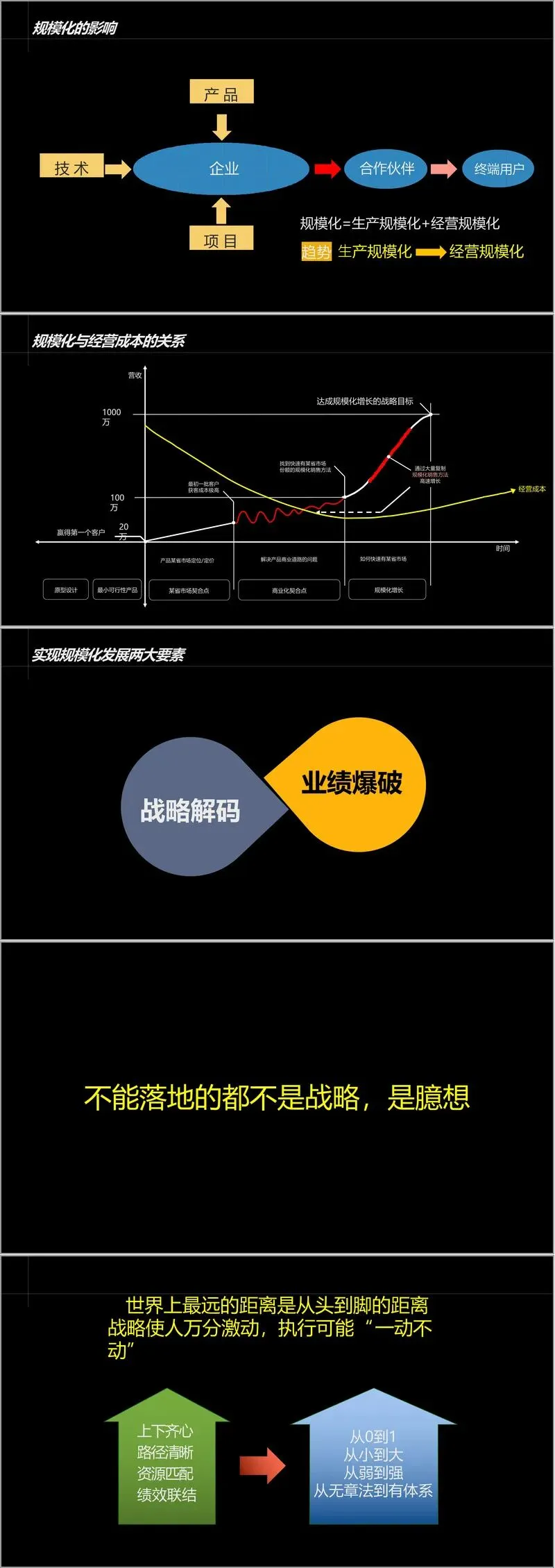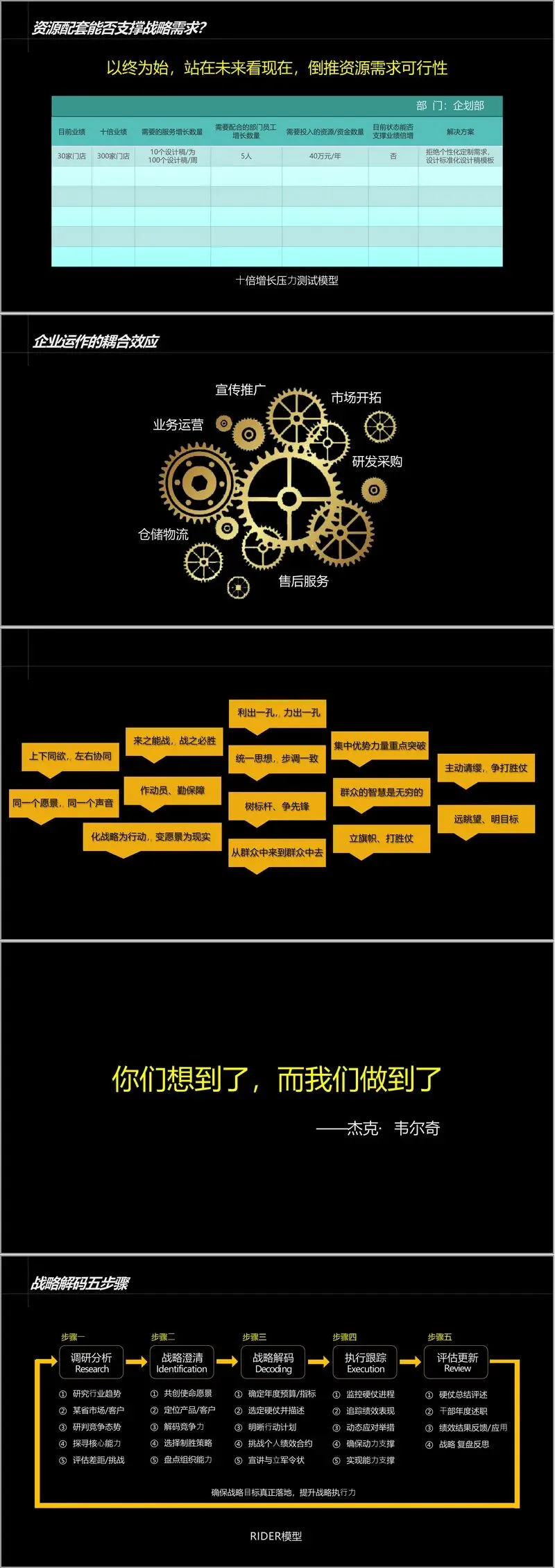 资料还针对不同企业类型提供了差异化策略,创业型和中小型企业应聚焦细分市场,打造性价比优势与客户黏性;大型企业则需通过规模化运营、生态化布局构建竞争壁垒。同时,通过十倍增长压力测试模型、经营预警机制等工具,帮助企业预判风险、优化资源配置,确保战略在复杂多变的市场环境中保持适应性与有效性。