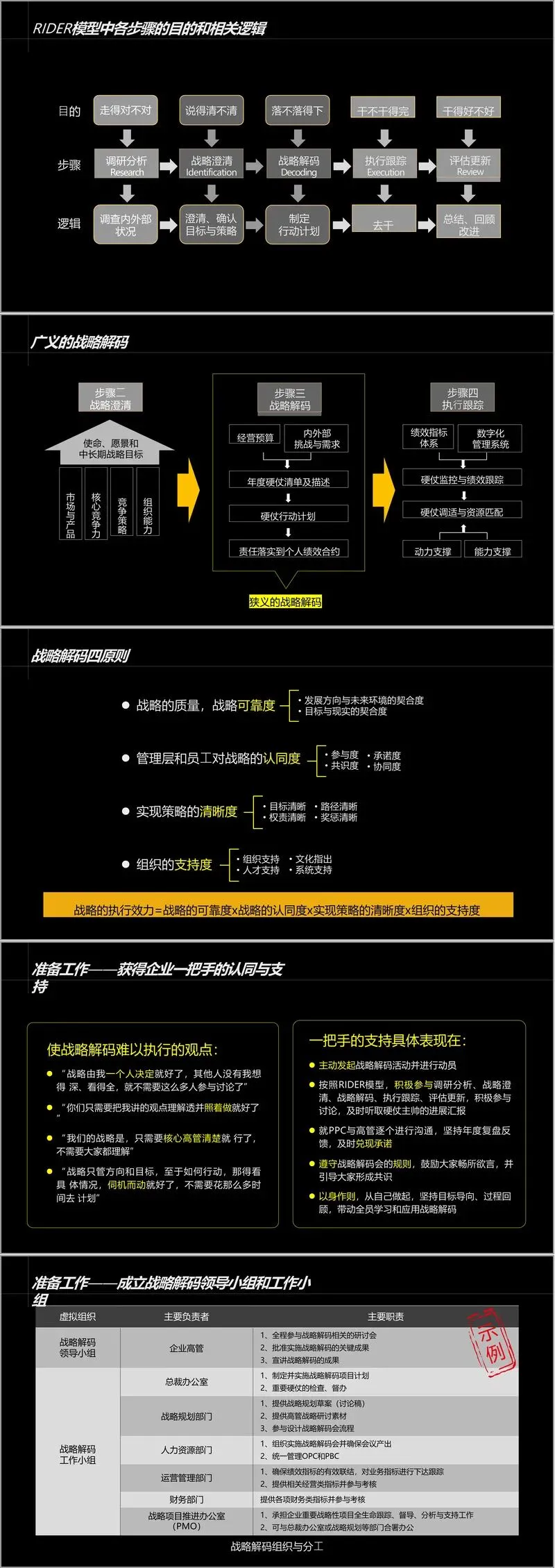 战略落地的核心工具是 RIDER 模型,通过调研分析、战略澄清、战略解码、执行跟踪、评估更新五个步骤,确保战略从制定到落地的闭环。调研分析阶段需运用商业模式画布、SWOT 矩阵等工具,全面剖析内外部环境、行业趋势、竞争态势与核心能力;战略澄清聚焦使命愿景、市场产品定位、核心竞争力等关键议题,形成共同的长期价值追求;战略解码是核心环节,通过八步曲锁定年度硬仗,分解为具体行动计划,并落实到个人绩效合约(PBC),实现权责清晰、目标联动;执行跟踪阶段设立战略项目推进办公室(PMO),通过季度通报会、半年工作会等机制进行过程监控与预警,及时调整资源配置;评估更新阶段通过硬仗评议会、个人述职会等形式复盘成果,优化战略,形成迭代升级。