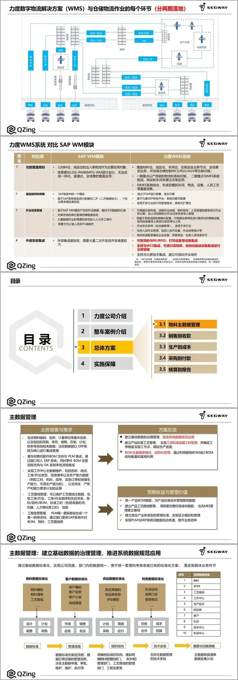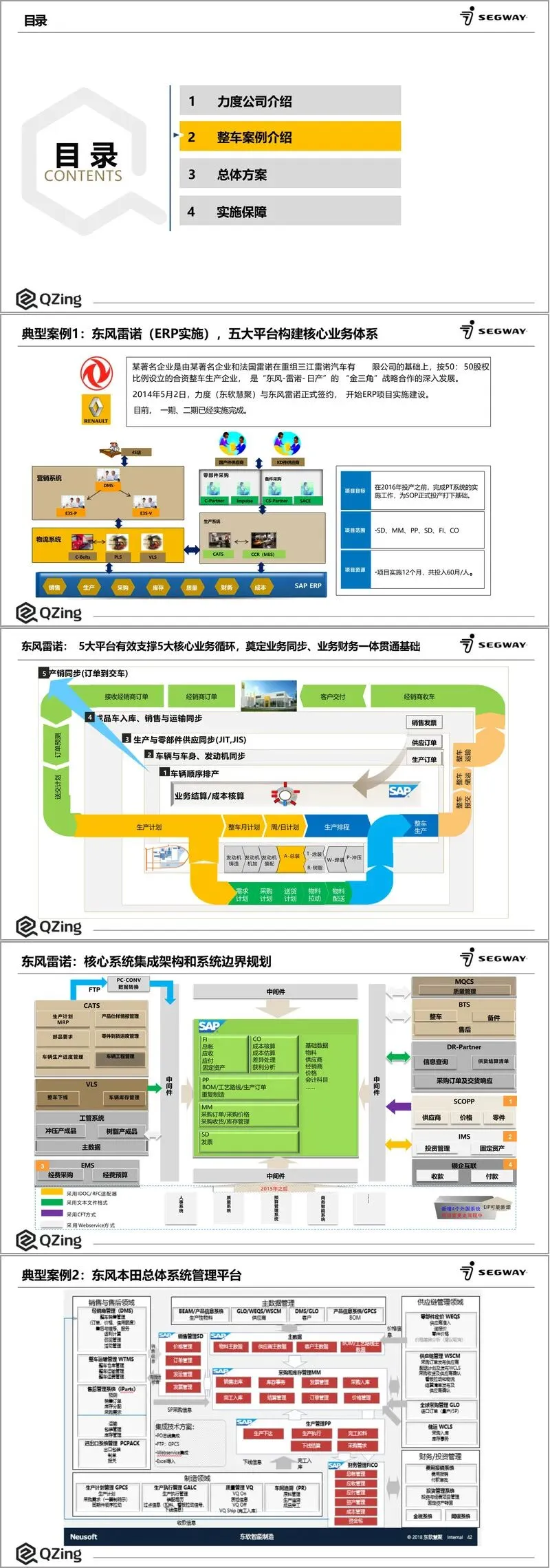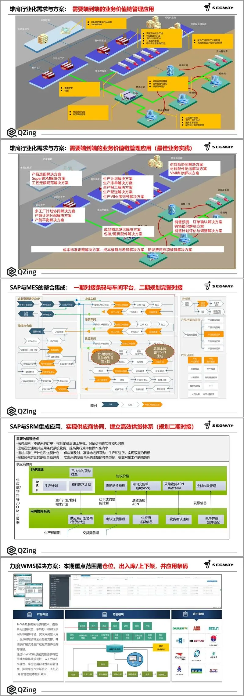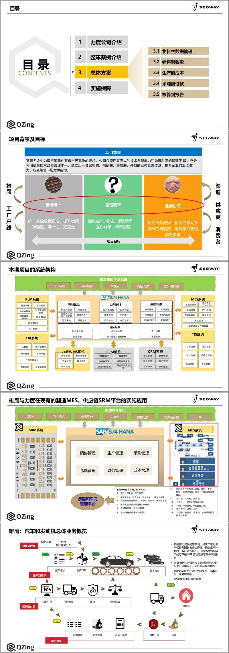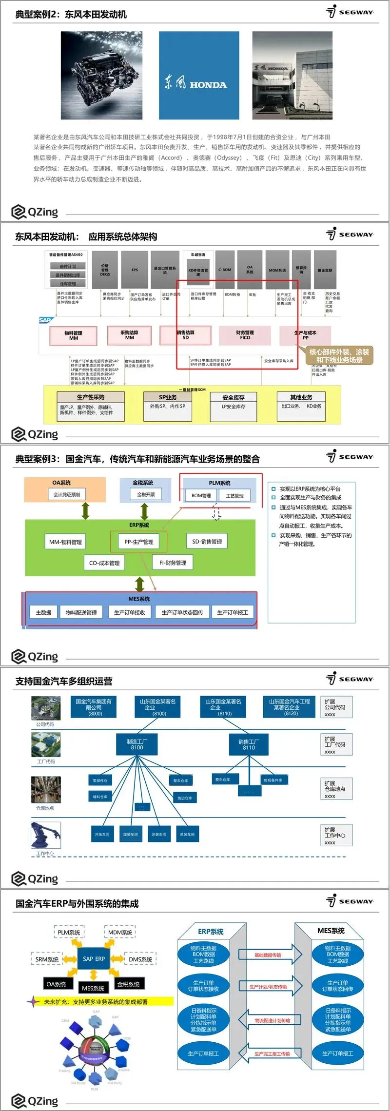 方案开篇通过东风雷诺、东风本田、国金汽车等典型案例,验证了 SAP 系统在汽车及相关制造领域的实践价值。东风雷诺项目通过 SD(销售与分销)、MM(物料管理)、PP(生产计划)、FI(财务会计)、CO(管理会计)五大核心模块,构建了销售、生产、采购、库存、财务一体化的业务体系,实现了车辆顺序排产、产销同步、零部件供应协同等关键业务循环。东风本田案例则聚焦发动机等核心部件的生产管理,通过 BOM 管理、进出口管理、成本核算等功能,实现了从采购到交付的全流程管控,其 “一票制” SCM 管理模式为平衡车集团的供应链协同提供了参考。国金汽车案例则展示了 SAP 系统对多组织运营、传统与新能源汽车业务整合的支撑能力,通过与 MES、DMS 等外围系统的集成,实现了基础数据、生产计划、物流配送等信息的无缝流转。