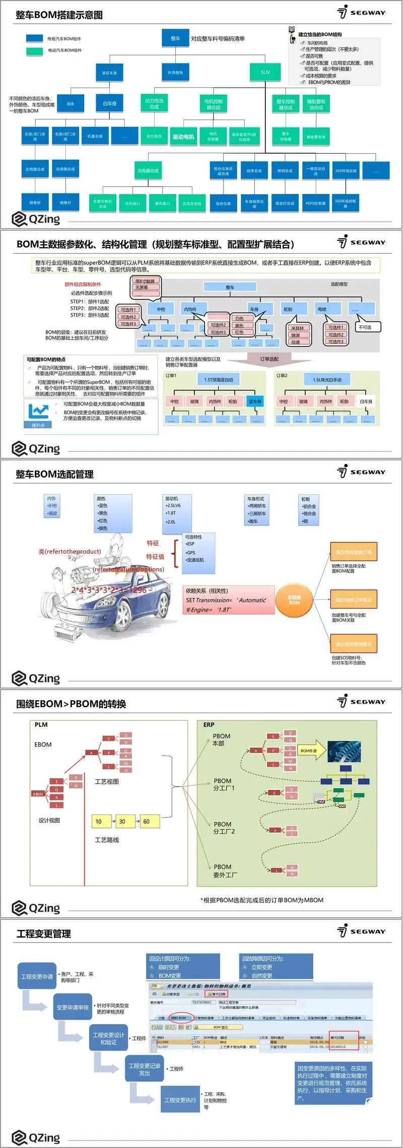 物料主数据管理是数字化建设的基础,方案强调建立统一的物料编码、BOM 结构、工艺路线等主数据标准,通过 SuperBOM 减少数据冗余,实现 BOM 数据与 PLM 系统的自动传递,同时建立规范的工程变更管理流程,确保数据的准确性和一致性。针对平衡车产品的配置化需求,方案设计了可配置 BOM 模型,支持客户个性化选配,通过对象相关性逻辑自动匹配组件,降低订单处理复杂度。