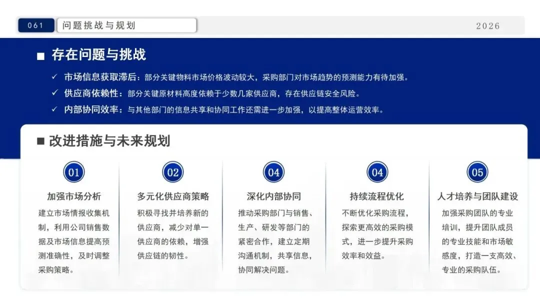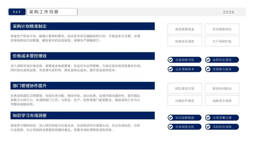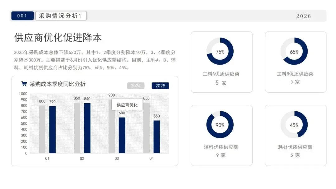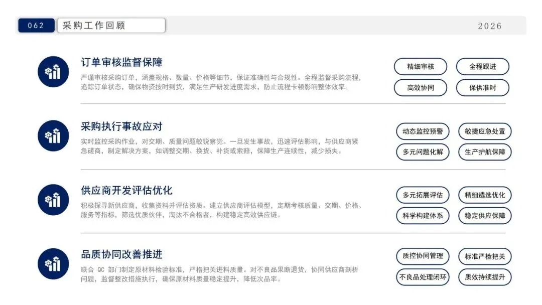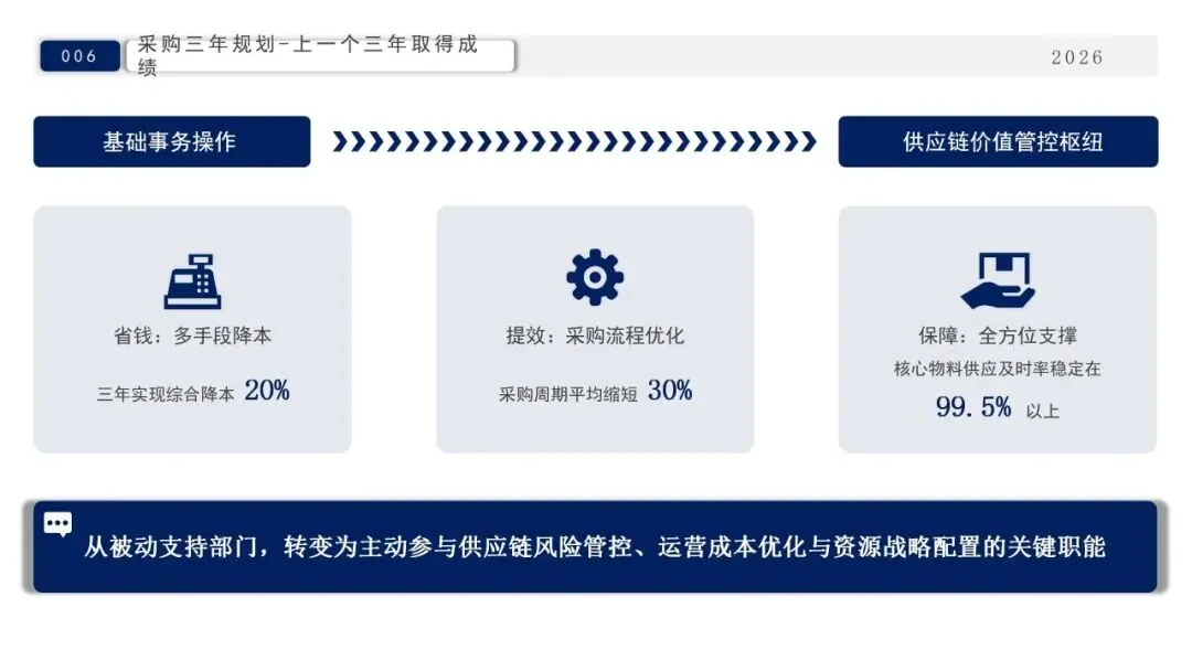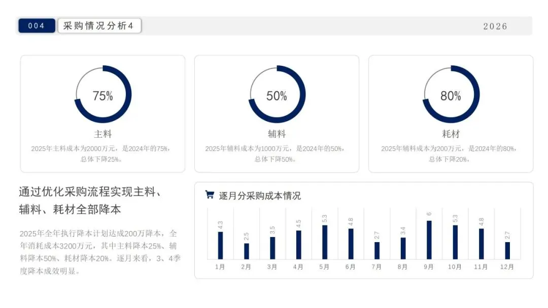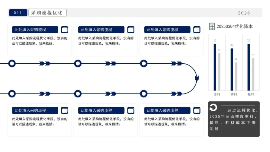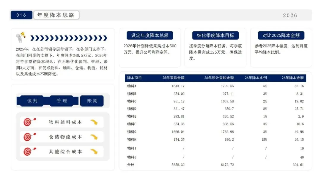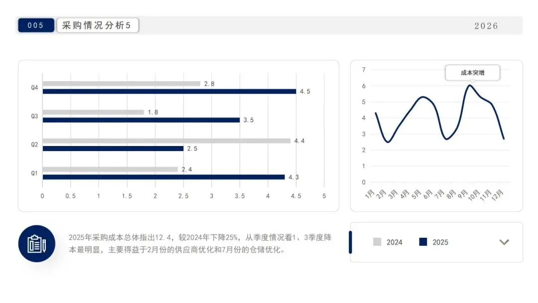 围绕2025年采购工作全面复盘、现存问题分析及2026年战略规划展开,核心聚焦降本增效、供应商优化、流程升级、供应链风控四大方向,覆盖成本管控、供应商管理、组织架构、生产协同等多维度内容,以下为核心要点总结,关键成果数据见下表: