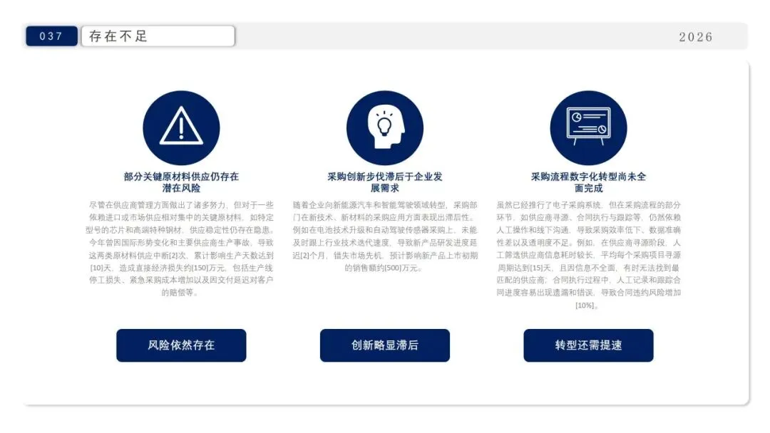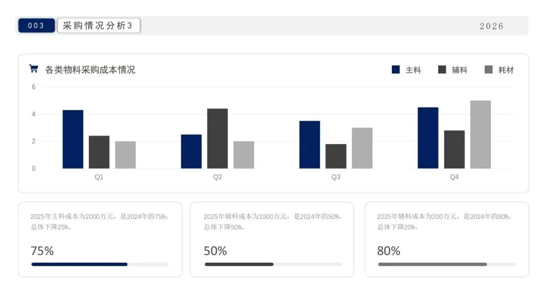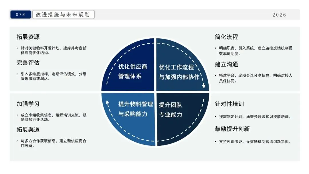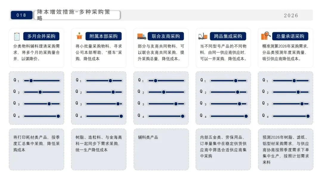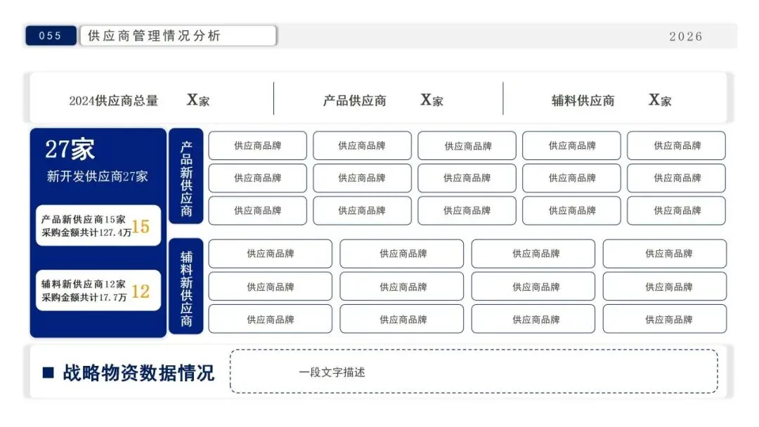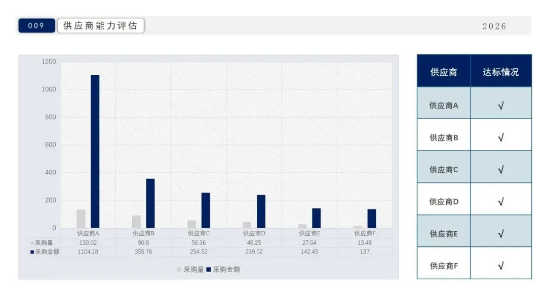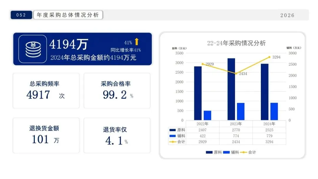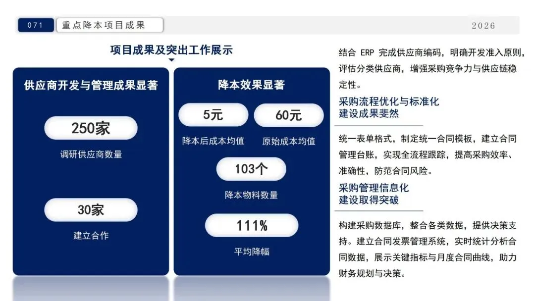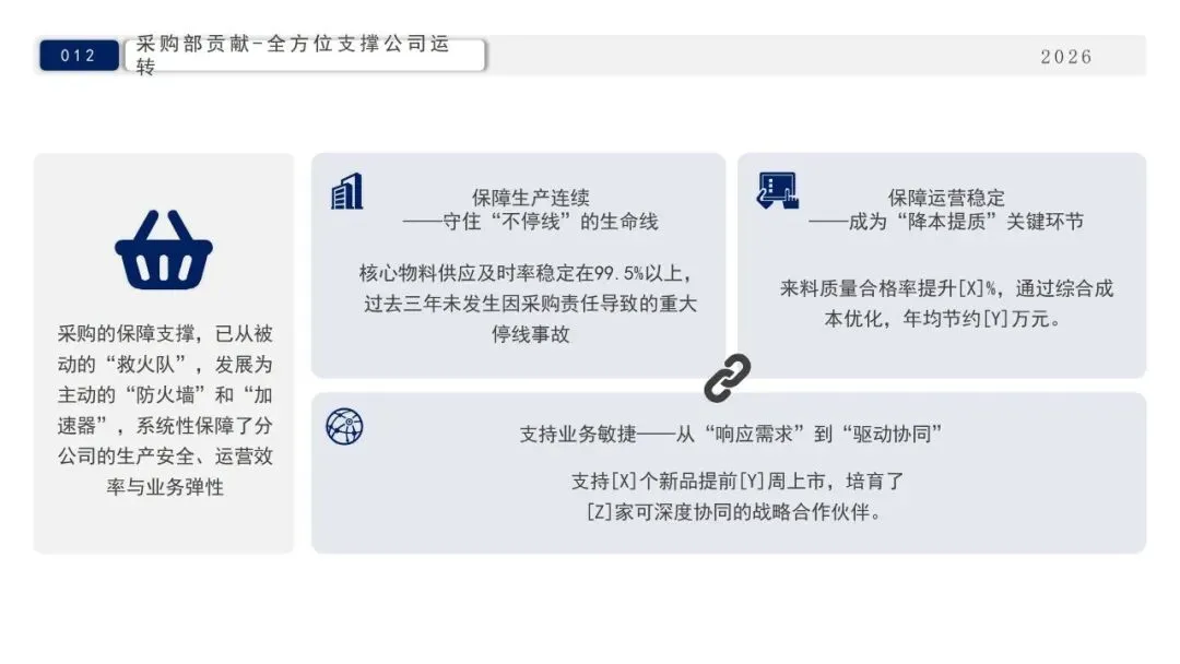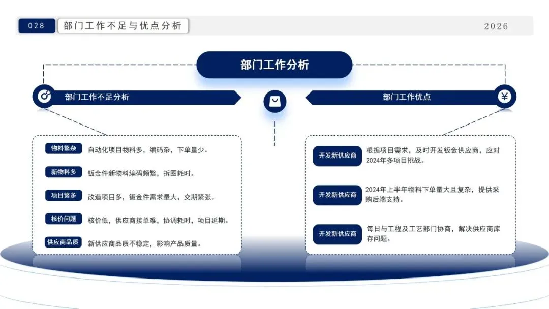 围绕2025年采购工作全面复盘、现存问题分析及2026年战略规划展开,核心聚焦降本增效、供应商优化、流程升级、供应链风控四大方向,覆盖成本管控、供应商管理、组织架构、生产协同等多维度内容,以下为核心要点总结,关键成果数据见下表:
