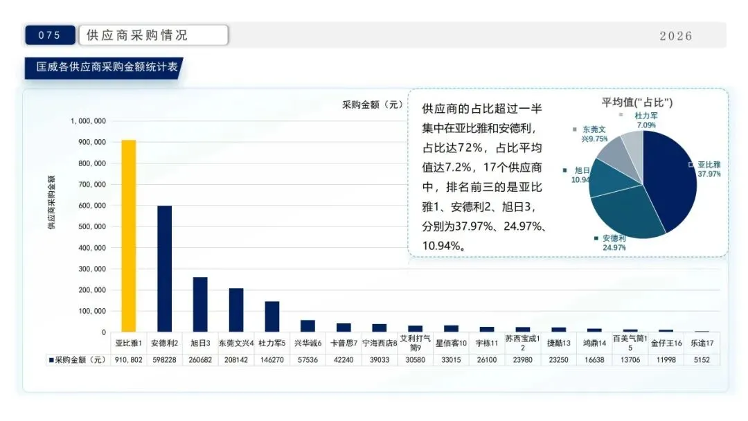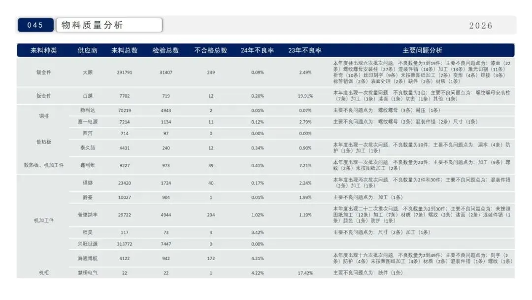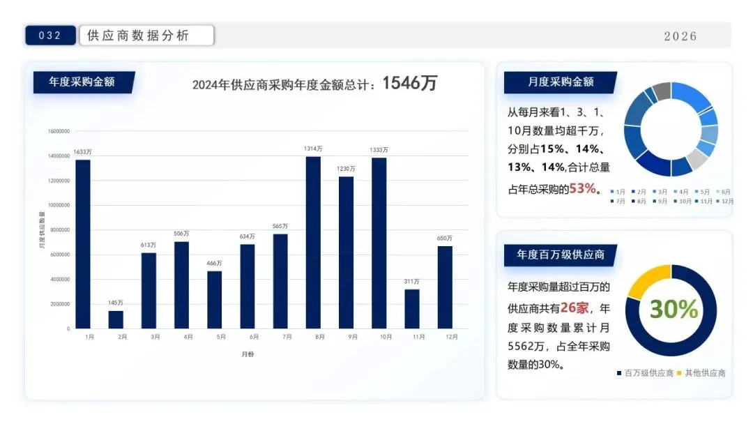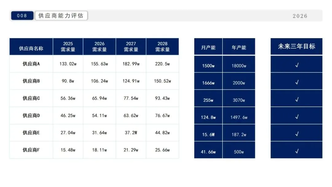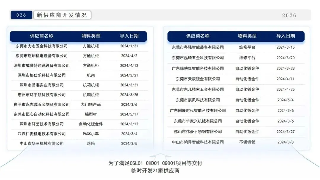 | A类供应商占比60%,主料/辅料/耗材供应商池分别扩大10%/13%/20%;来料合格率同比提升,核心物料供应及时率99.5%以上 |