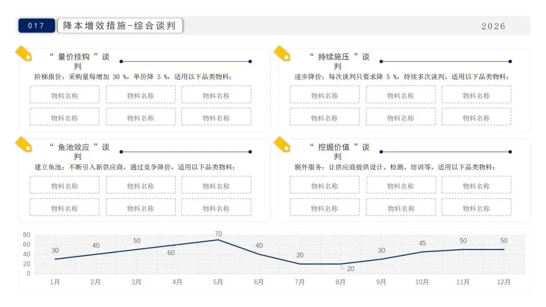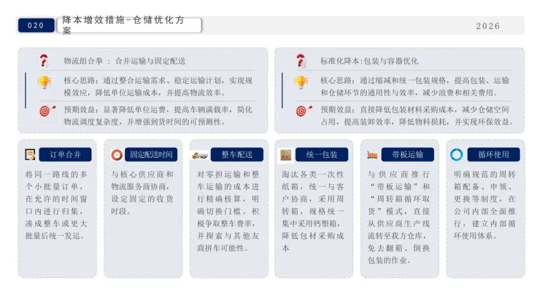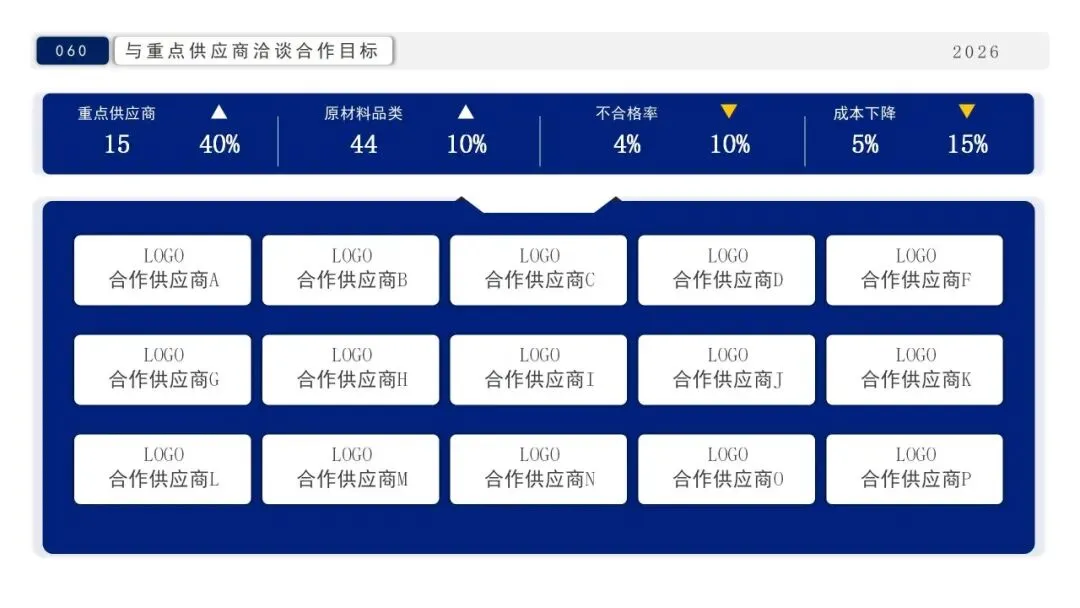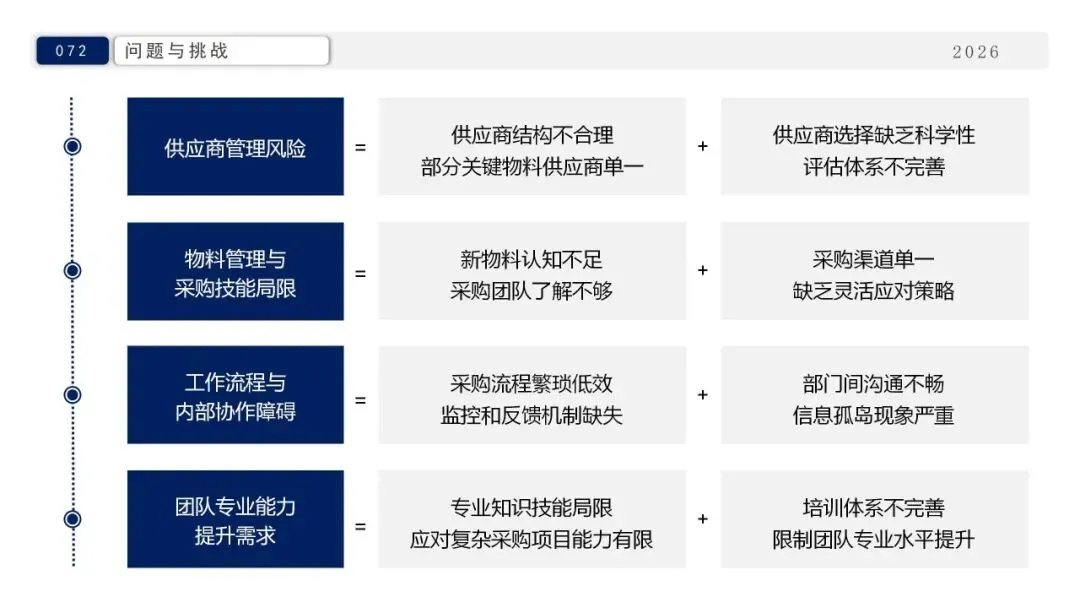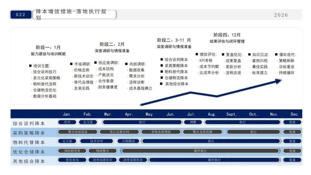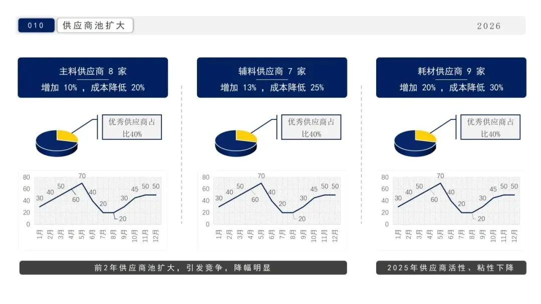 | | 1. 设定降本率、准时交付率等KPI;2. 固化供应商分级标准与合作规则;3. 嵌入风险防控机制(备用供应商、安全库存) | | |
