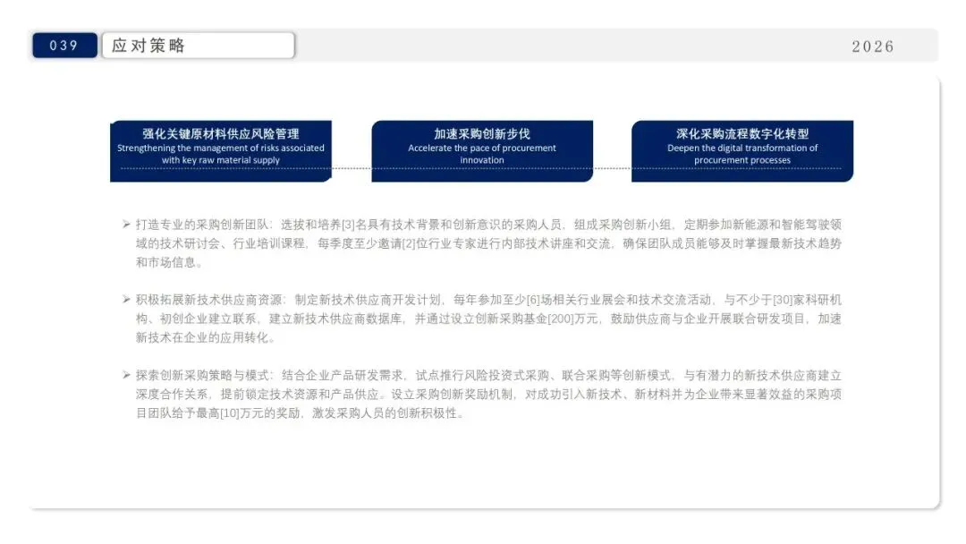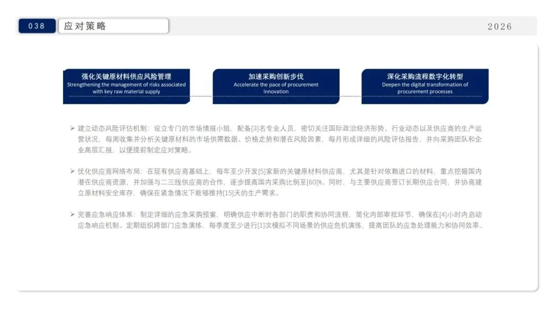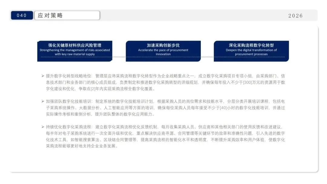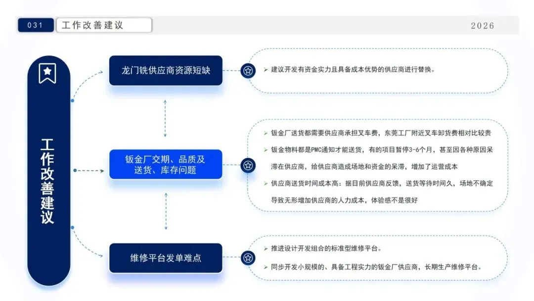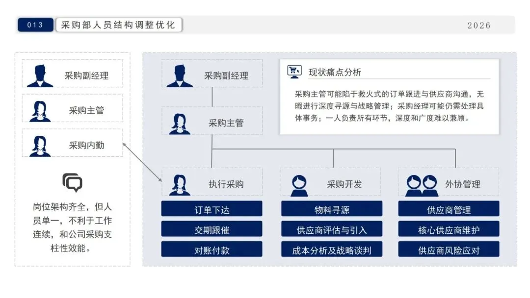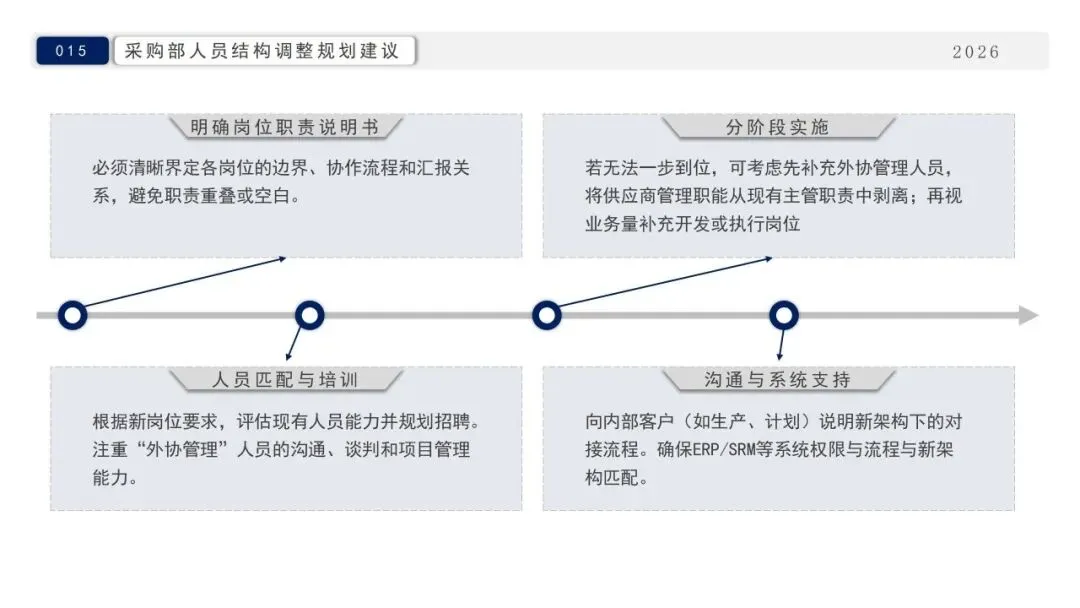 | | 1. 设定降本率、准时交付率等KPI;2. 固化供应商分级标准与合作规则;3. 嵌入风险防控机制(备用供应商、安全库存) | | |