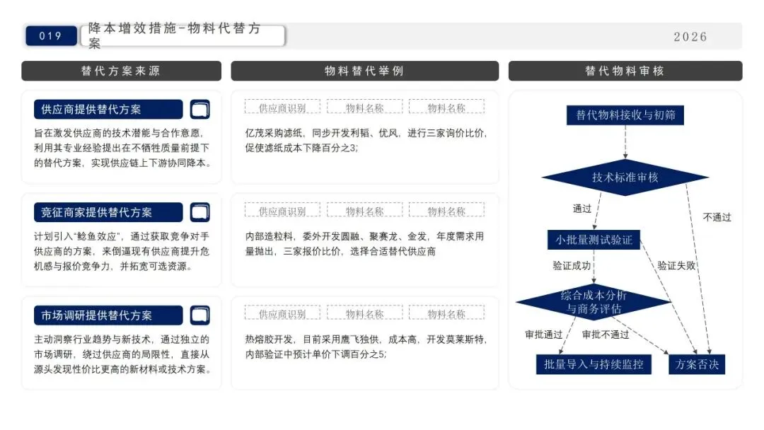 | | 1. 小批量试点运行(如新材料替代、新供应商合作);2. 对比实际结果与目标差异;3. 收集跨部门反馈 | | |