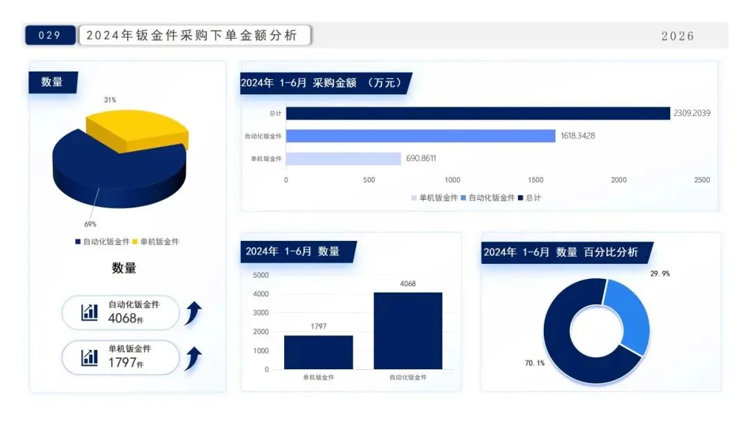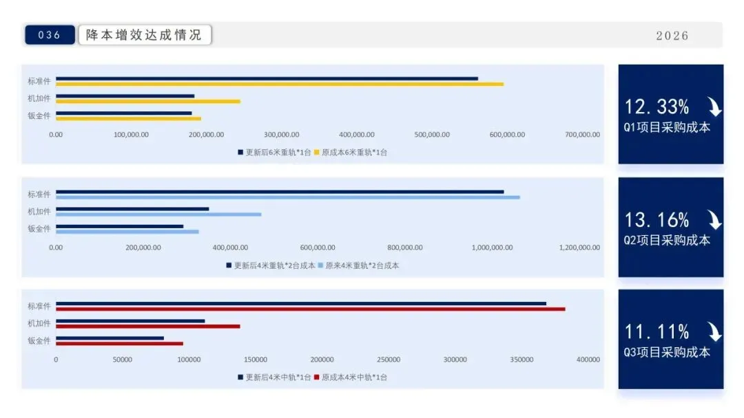 | 采购周期平均缩短30%;精细车间自动化改造后产能提升,人员精简33%,月节约人力成本8.4万 |