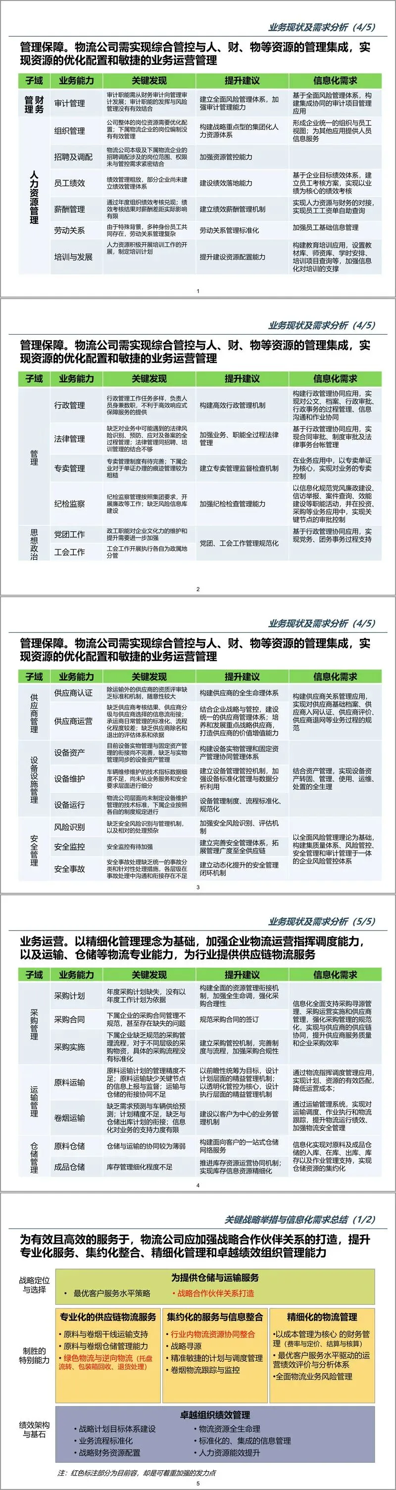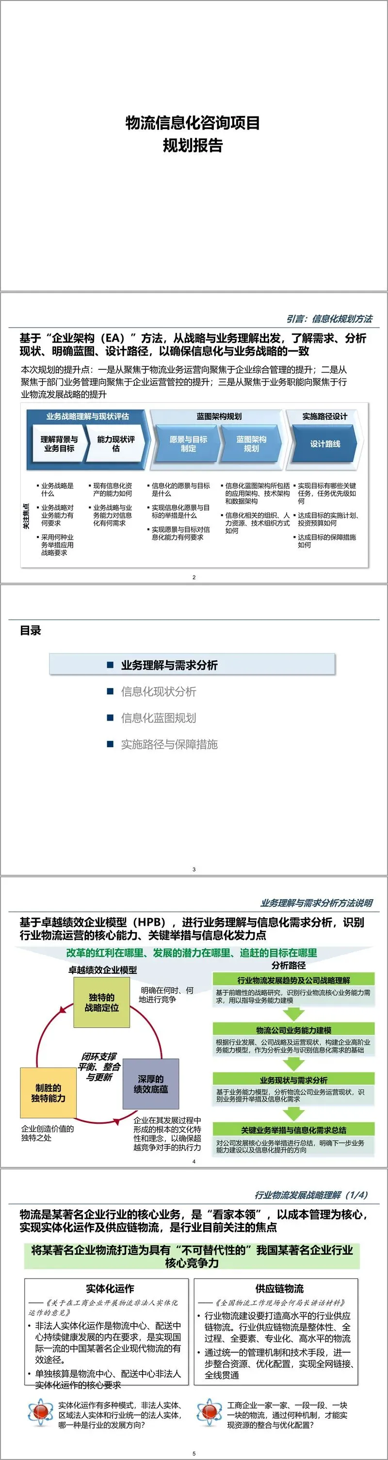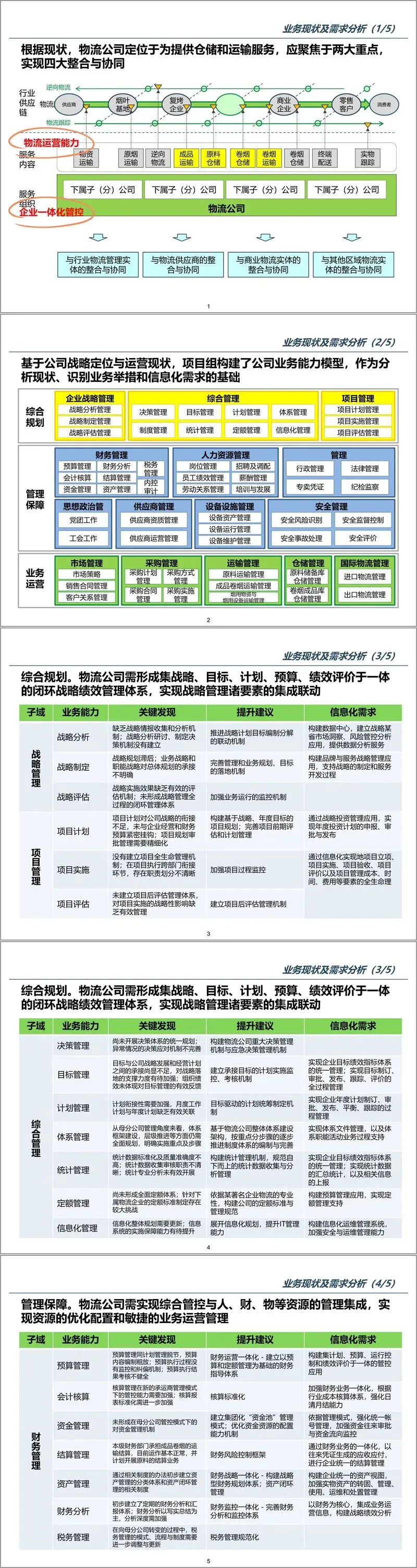 方案以 “战略与业务对齐” 为核心逻辑,采用 “业务理解 - 现状分析 - 蓝图规划 - 路径设计” 的四步规划方法,确保信息化建设与企业战略紧密衔接。在业务理解与需求分析阶段,方案基于卓越绩效企业模型(HPB),深度解读了物流行业实体化运作、供应链物流一体化的发展趋势,明确物流企业需具备专业化供应链服务、集约化信息整合、精细化物流管理、高绩效组织管理四大核心能力。结合物流公司战略定位 —— 某省市场竞争能力的区域性物流运营实体,方案梳理出企业在战略管理、业务运营、管理保障三大领域的核心需求,识别出战略规划滞后、物流资源整合不足、财务业务脱节、数据标准缺失等关键问题。