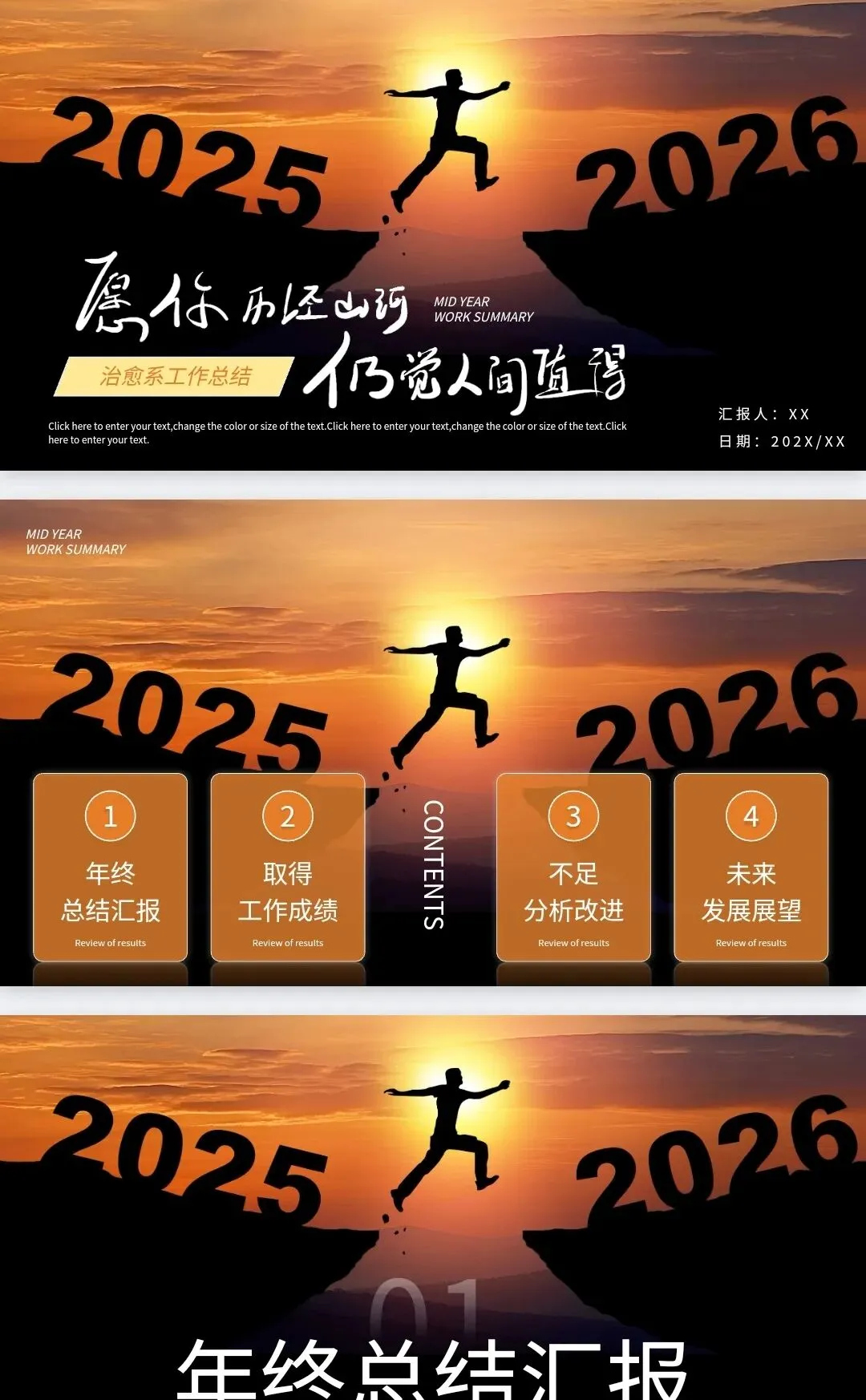 2025 年工作收官,一份逻辑清晰、成果突出、复盘到位的工作总结,是对全年工作的完整梳理,更是向领导汇报、为团队复盘的核心载体!这份【2025 通用工作总结 PPT 模板】,适配全行业、各层级复盘需求,从成果展示到问题分析,从经验总结到来年规划,完整覆盖工作总结全维度,帮你高效梳理工作、突出核心亮点,轻松完成年终复盘!(适配企业整体 / 各部门年度 / 季度工作总结、团队工作复盘、个人岗位述职、项目成果汇报等场景,涵盖工作总览、核心成果、数据复盘、问题分析、经验总结、不足改进、来年规划、致谢等完整核心模块,可自由编辑行业、部门及具体工作内容)