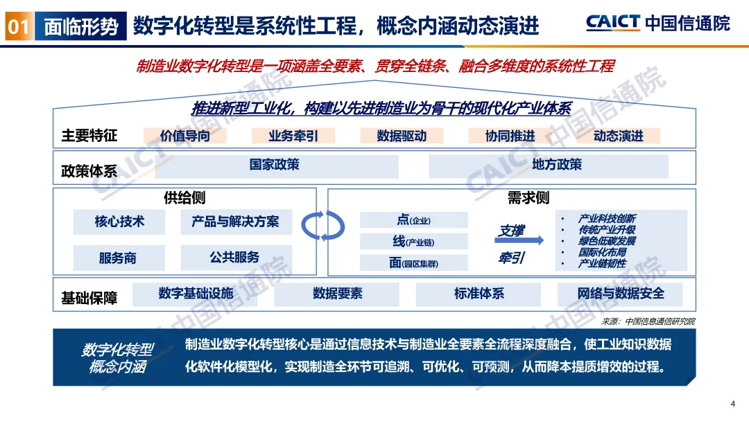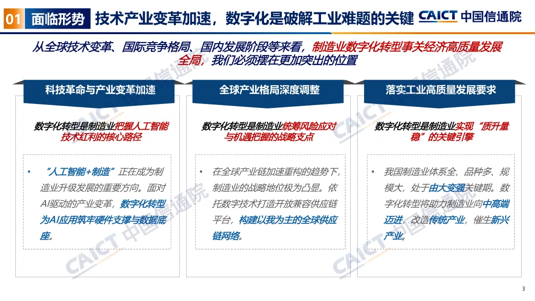 国家高度重视制造业数字化转型,领导多次强调,要把握数字化、网络化、智能化方向,推动制造业数字化,利用互联网新技术对传统产业进行全方位、全链条的改造,提高全要素生产率,发挥数字技术对经济发展的放大、叠加、倍增作用。未来五年是我国制造业数字化转型从“标杆引领”向“规模推广”转变、从“数字赋能”向“智能应用”跨越的关键阶段,亟需加强经验总结和形势研判,科学谋划转型路径,更好推动制造业数字化智能化发展,为构建现代化产业体系、推进新型工业化开辟新道路、打造新优势。