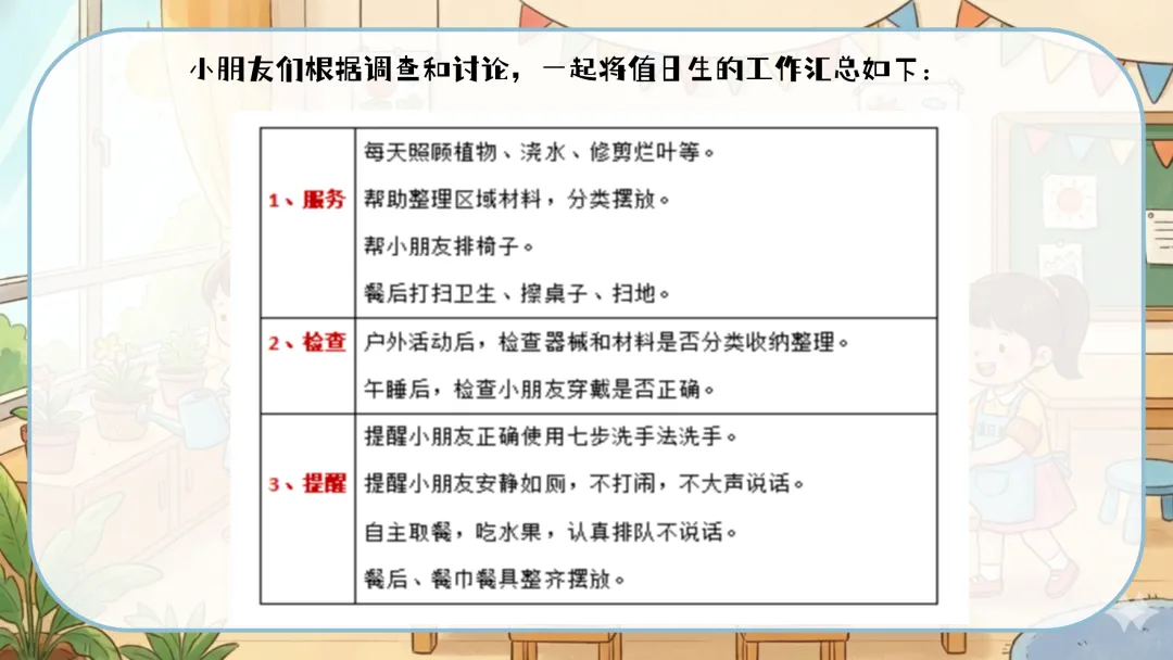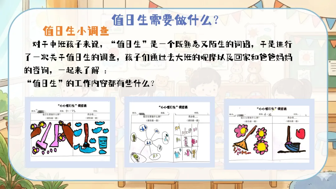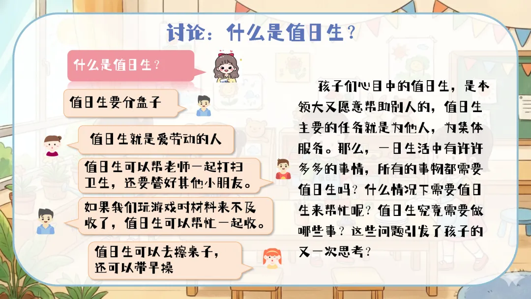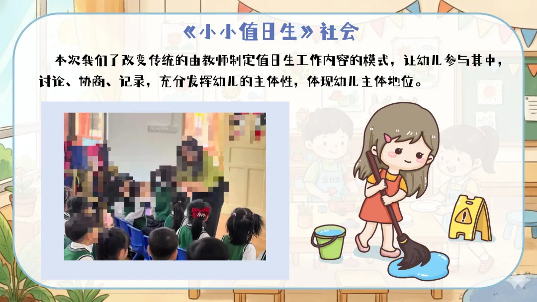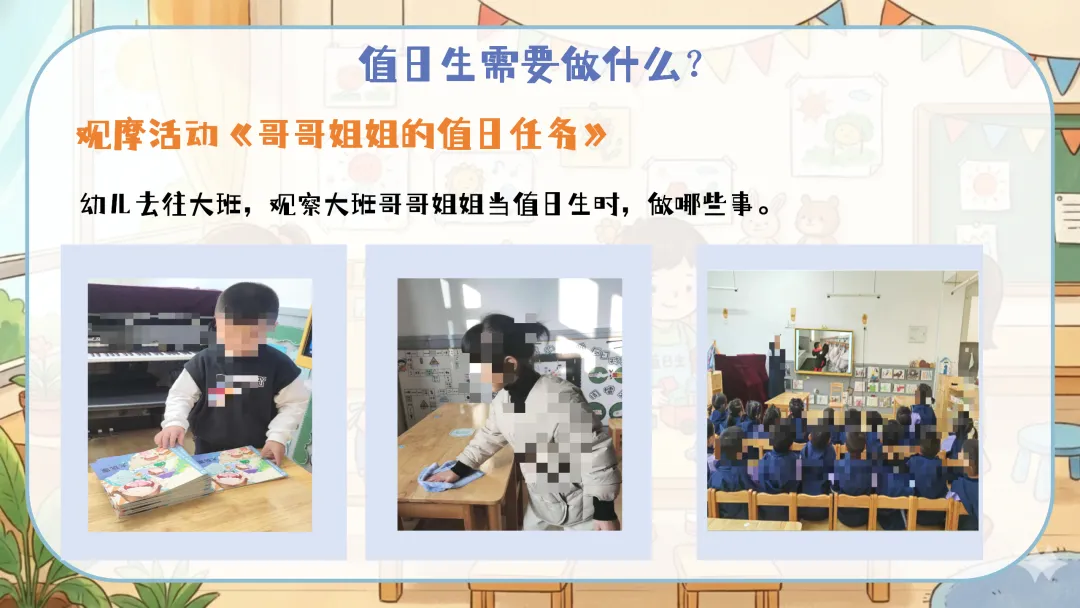 值日生牌改进:定期组织幼儿讨论,根据实际使用情况对值日生牌进行改进,如增加更明确的工作图示、使用更耐用的材料等。