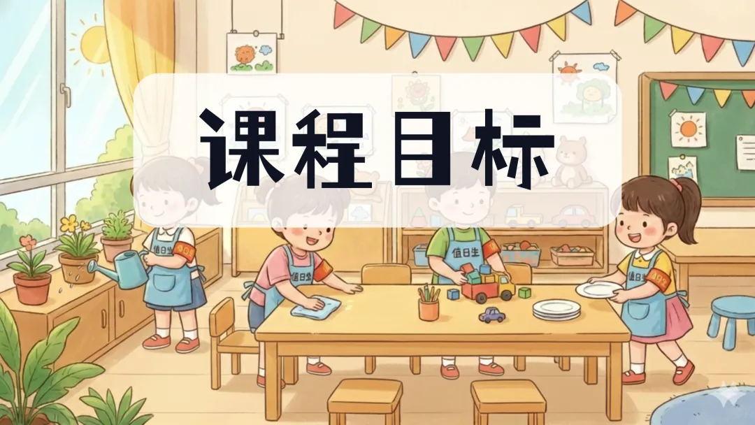 1、认知目标:了解值日生牌的作用,知道上面可以包含值日生姓名、值日日期及主要工作等信息。