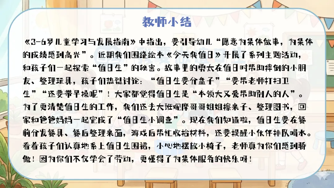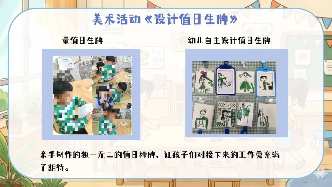 总体而言,通过本次活动,幼儿不仅在美术技能和测量能力上得到了发展,更重要的是增强了对集体劳动的责任感和自我服务意识。亲手制作的值日生牌让幼儿对值日生工作充满了期待,这将有助于他们更积极主动地参与到班级管理中。