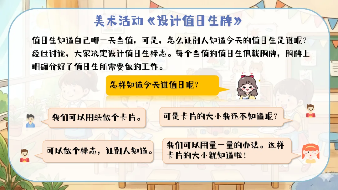 教师:“现在,请小朋友们也来当小小设计师,设计并制作一个属于自己的、独一无二的值日生牌吧!”