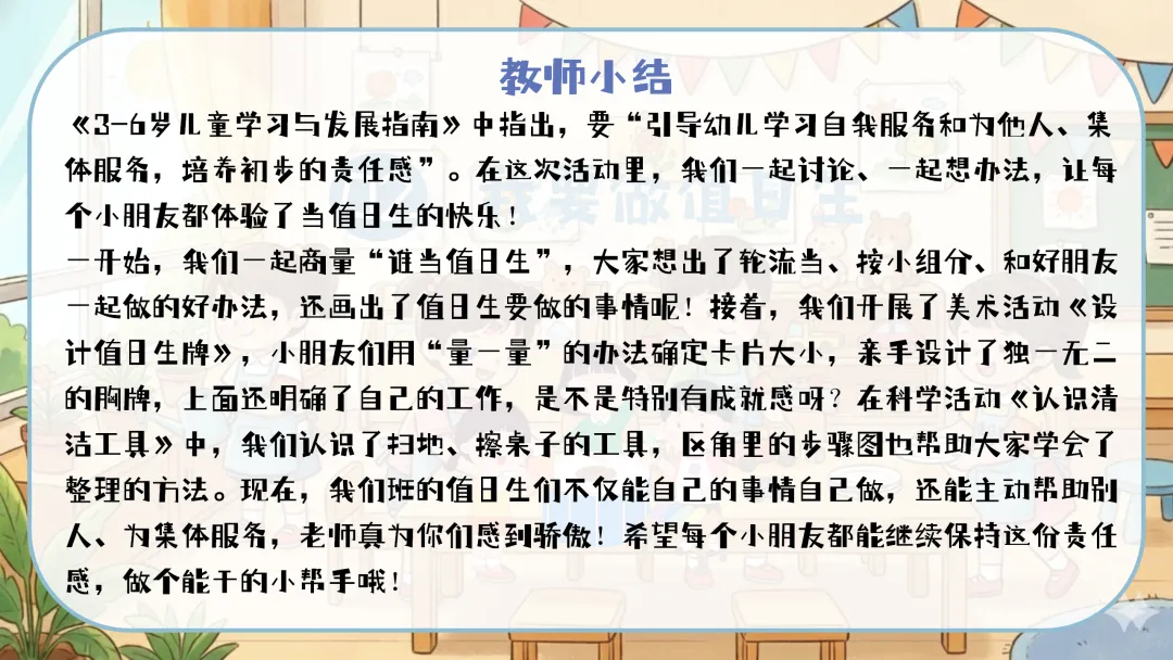 “明天开始,我们就可以轮流佩戴自己设计的值日生牌进行值日啦!我们还要看看谁的值日生牌最清晰、最漂亮,谁的值日生工作做得最认真哦!”