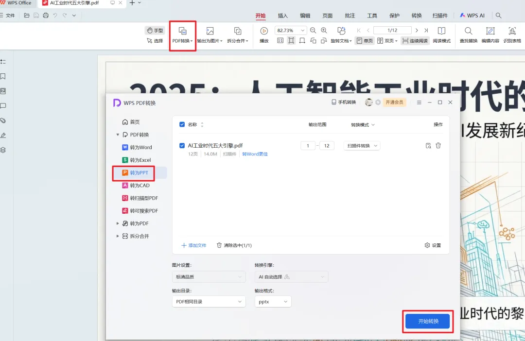 2. 在菜单栏找到【PDF 转换】,选择【转为 PPT】,点击开始转换。