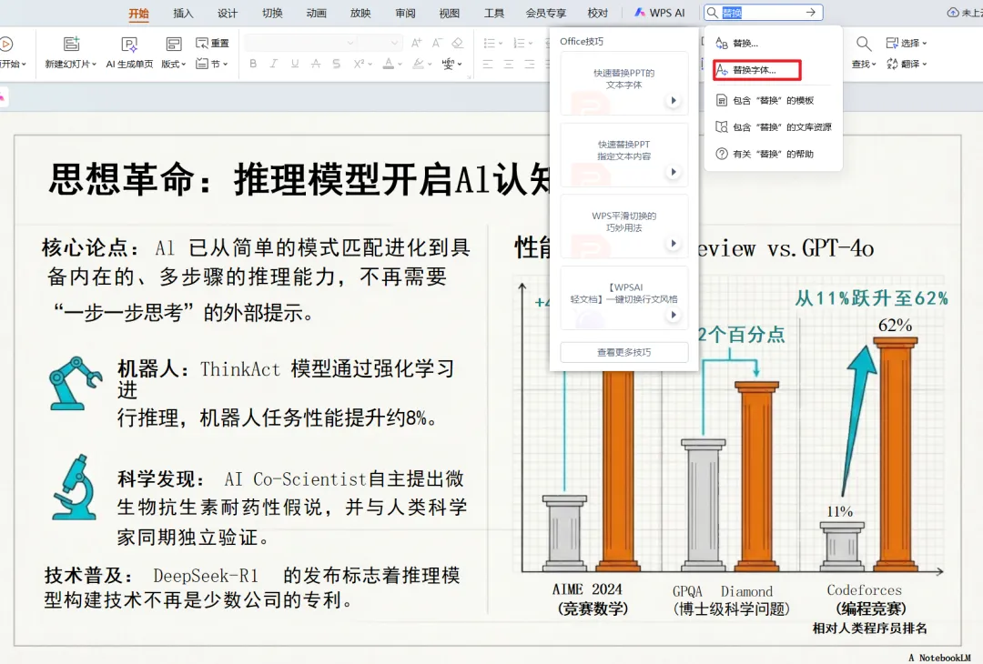 3. 统一字体: 转换后的字体可能杂乱,利用 WPS 的【替换字体】功能,一键统一全文档样式。