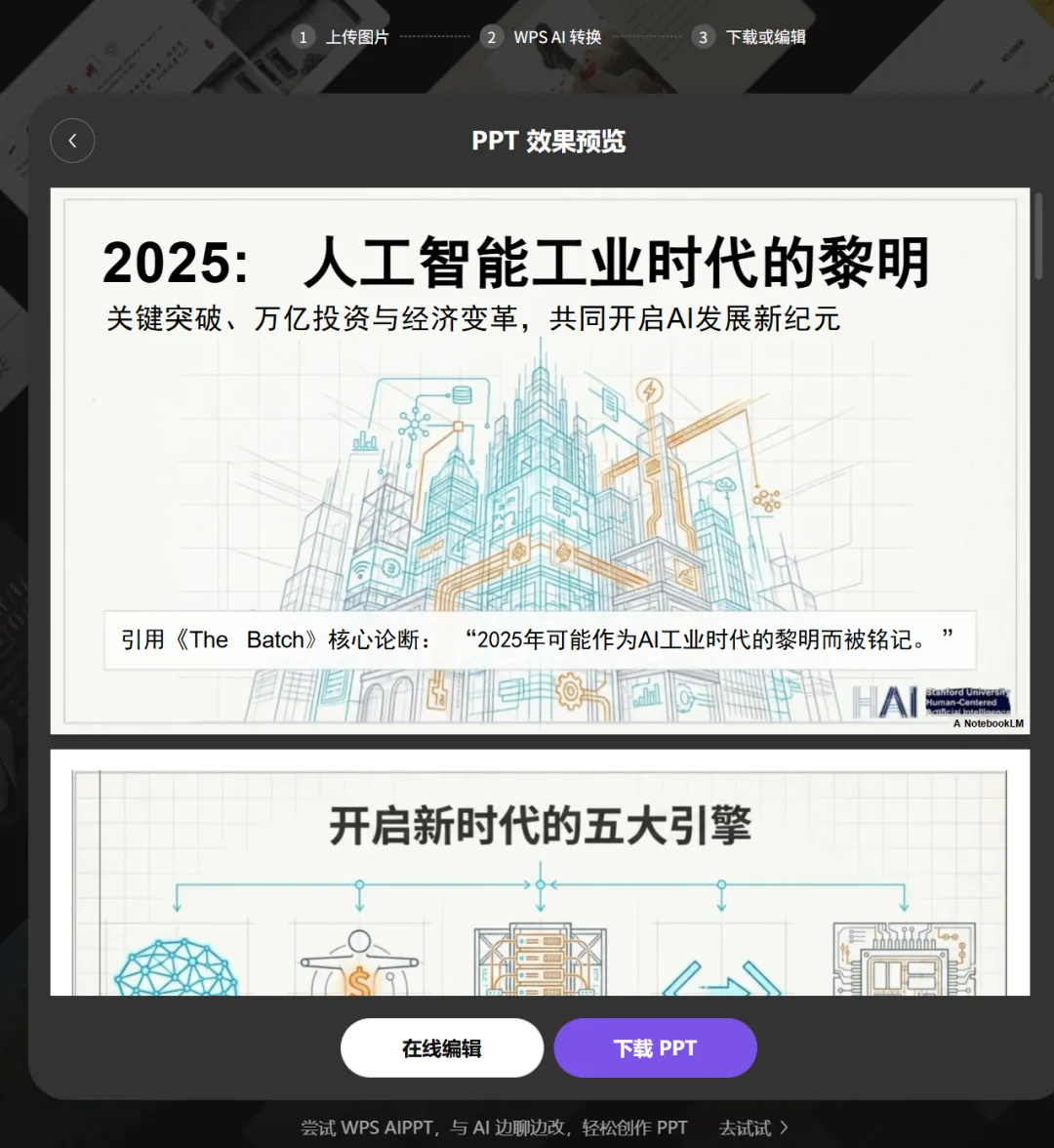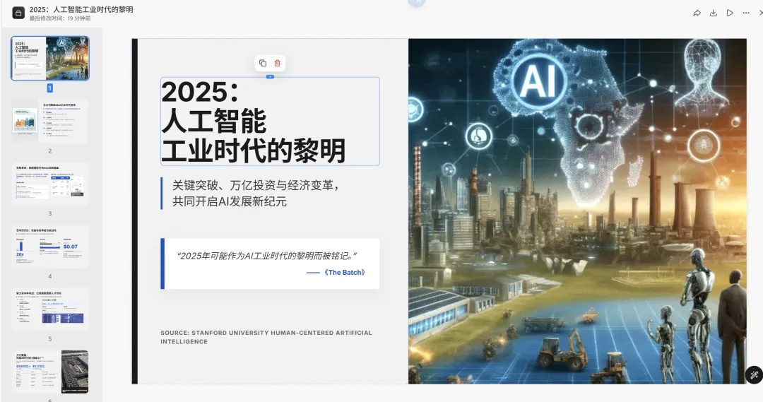 - 优点: 生成的 PPT 结构性强,文字逻辑一致,是真正的“原生 PPT”,完全可编辑。