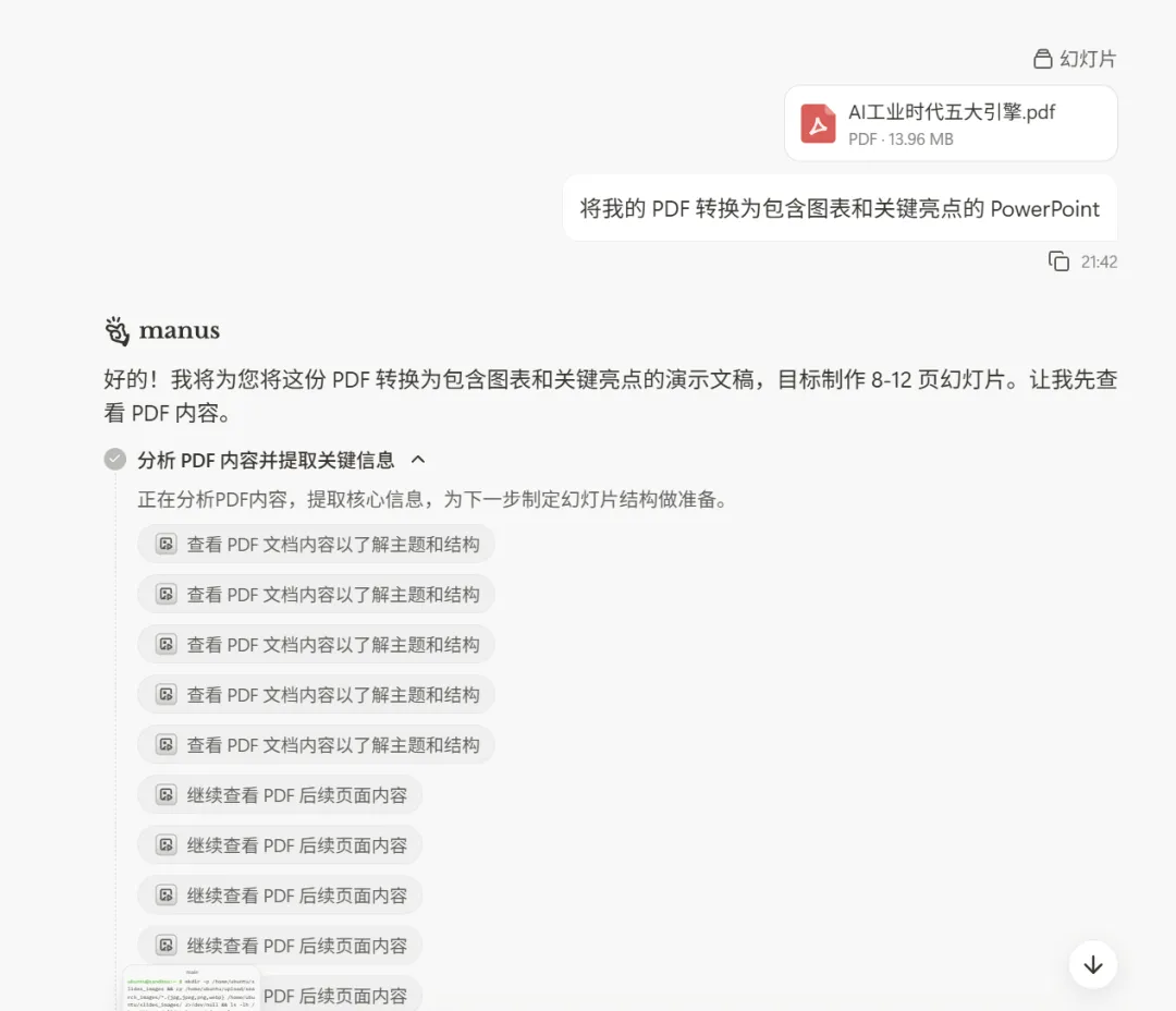 Prompt (提示词) 参考:"请将我上传的 PDF 转换为包含图表和关键亮点的 PowerPoint 文件。"