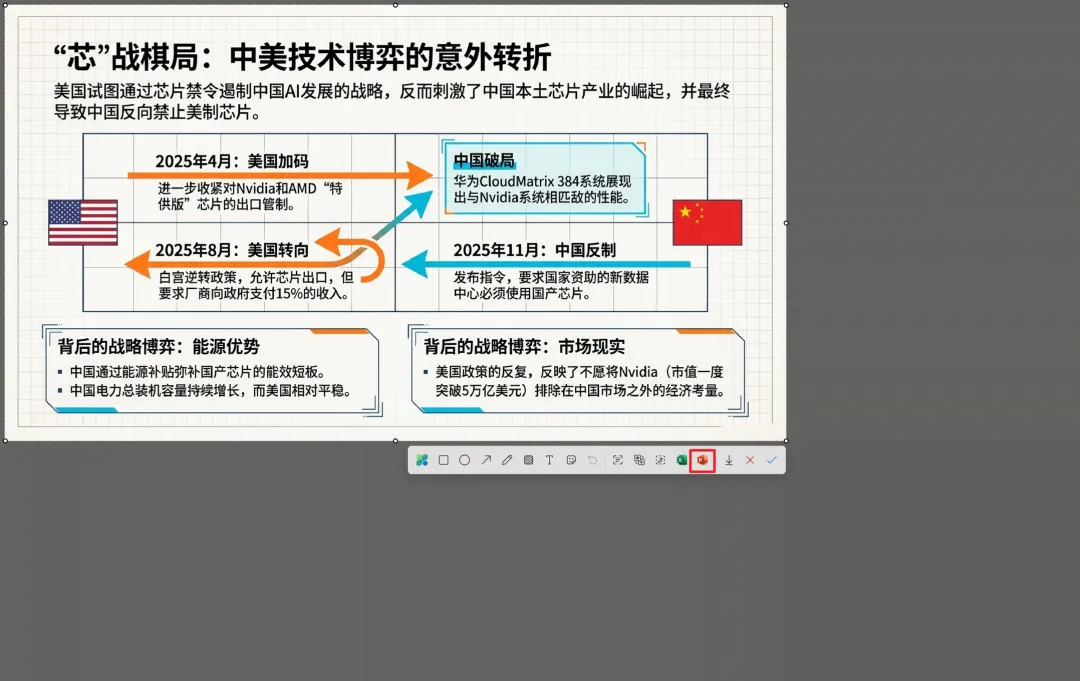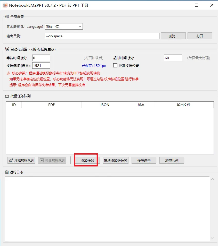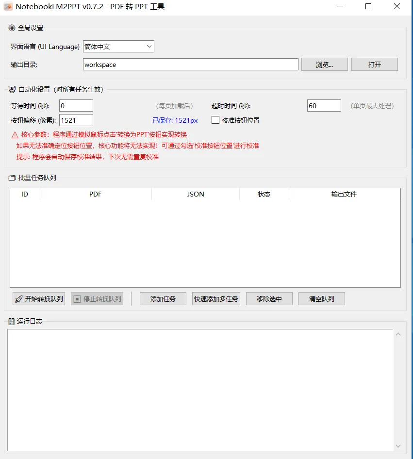 NotebookLM2PPT 工具(https://github.com/elliottzheng/NotebookLM2PPT)。 - 关键步骤: 点击【开始转换队列】。工具会自动利用微软的 OCR 功能框选图片。这时候我们需要保持鼠标静止等待自动点击转换。等工具自动框选,然后我们点击转换成PPT的图标。这时候软件会记住我们点击的位置,后续就会自动点击该位置转换。遇到识别卡住的情况,我们也可以使用esc退出,然后手动使用ctrl+shift+a快捷键框选图片部分,再点击输出为PPT格式。最终输出结果在输出目录(默认为workspace)下。