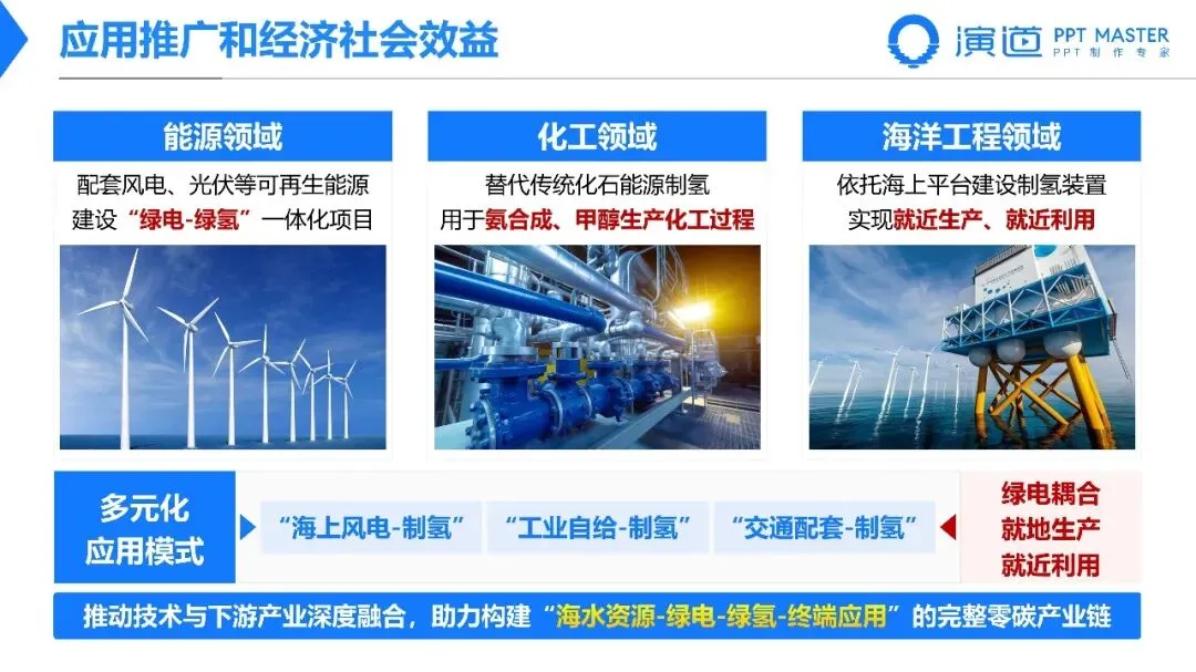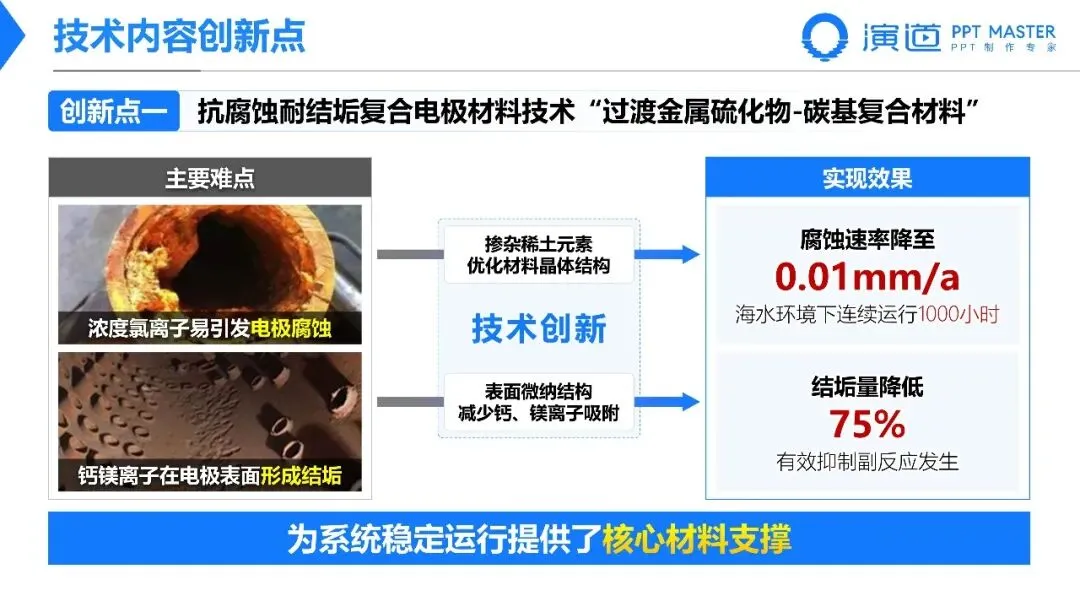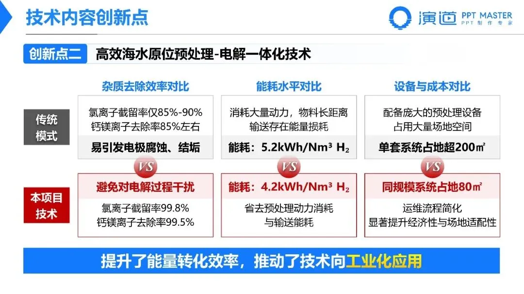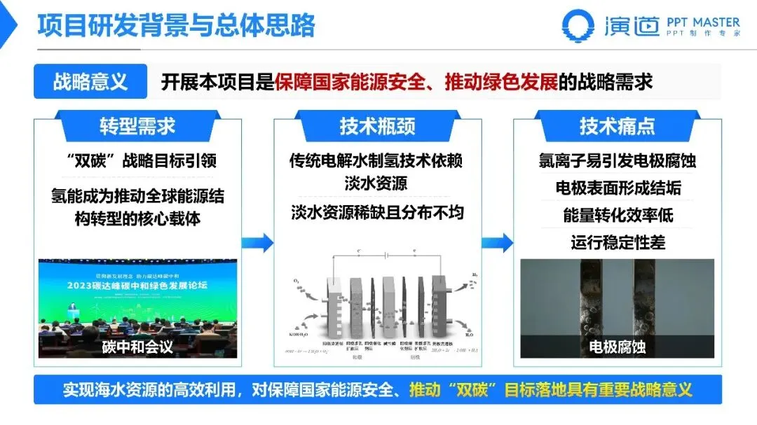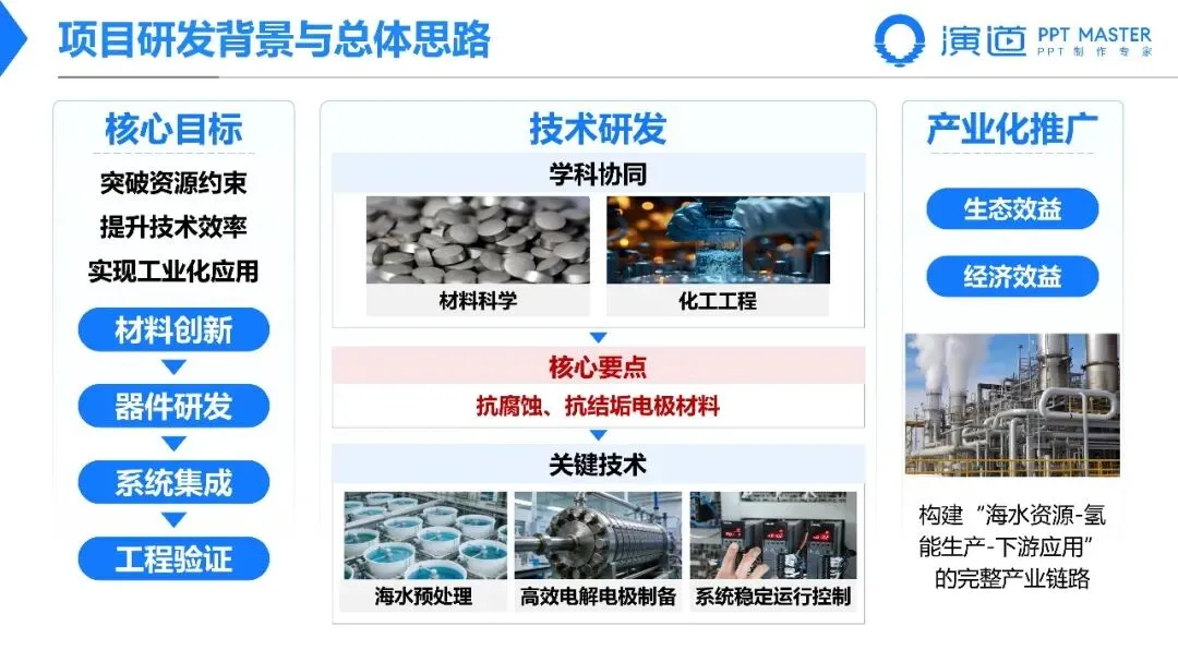 PPT 以 “项目背景 — 总体思路 — 技术创新” 为主线,先阐明海水制氢在能源转型中的战略意义与核心痛点,再明确 “材料创新 — 器件研发 — 系统集成 — 工程验证” 的全链条路径,聚焦抗腐蚀、抗结垢电极材料这一核心要点,最后从电极材料技术、海水预处理 - 电解一体化技术两大维度呈现突破,逻辑清晰、重点突出,精准契合省科奖对技术原创性、工程实用性与产业引领性的评审要求。