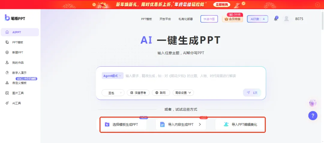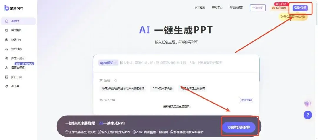 登录后直达首页核心——一键生成PPT界面。在此,您仅需输入主题,AI即可为您构思并创作演示文稿。