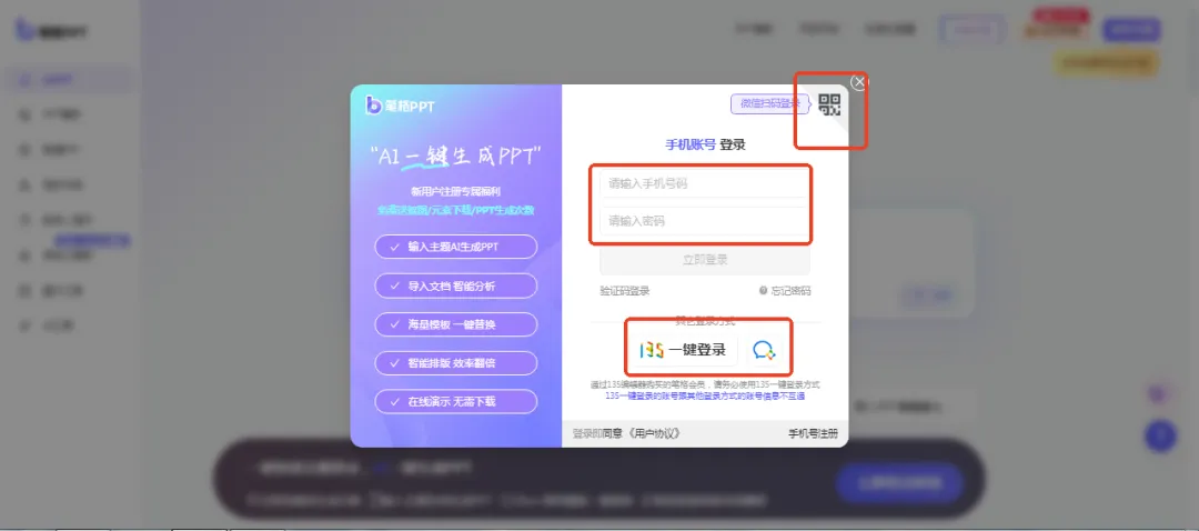 复制网址到浏览器,点击登录/注册,笔格PPT支持手机号、微信扫码、企业微信等方式登录。