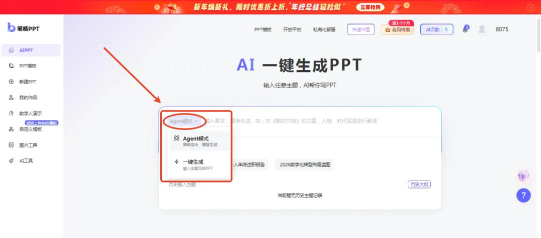 系统提供两种智能模式:“Agent模式” ,适用于相对明确的指令,AI将精准执行与细化;“一键生成模式”,则只需输入核心主题,AI便自主完成内容规划与设计。请根据您的需求灵活选用,轻松开启高效创作。