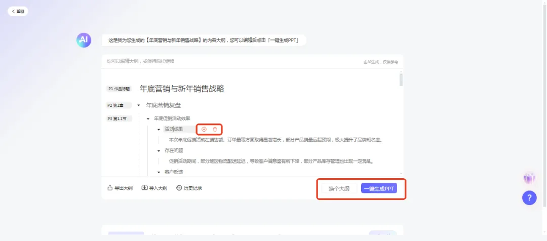 在生成的大纲中,您可随时编辑:点击任意标题直接修改内容,右侧支持新增或删除页面。若对整体结构不满意,可点击“换个大纲”重新生成。确认无误后,点击“一键生成PPT”即可进入下一步。