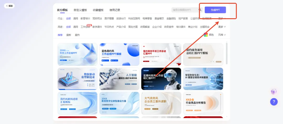 页面跳转到模板选择页面,选择合适的模板,即可点击“生成PPT”。