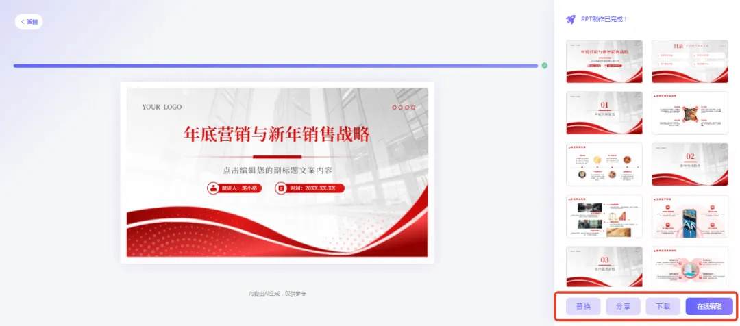 PPT生成后,可以点击“替换”进行更换模板,还可分享、下载以及在线编辑。