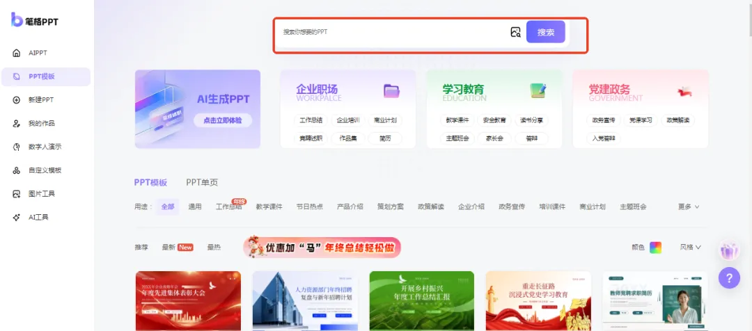 笔格PPT提供了海量的模板,可以直接进行搜索,选择合适的PPT进行在线编辑。