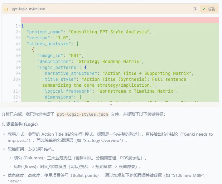 我找了几份贝恩咨询(Bain)的经典 PPT,直接“喂”给了 AI。我对它说:“你是个顶级设计师,帮我分析一下这些 PPT 好在哪里,把它们的逻辑框架、排版规律、配色方案都给我提取出来,生成一份《优秀 PPT 风格指南》。”