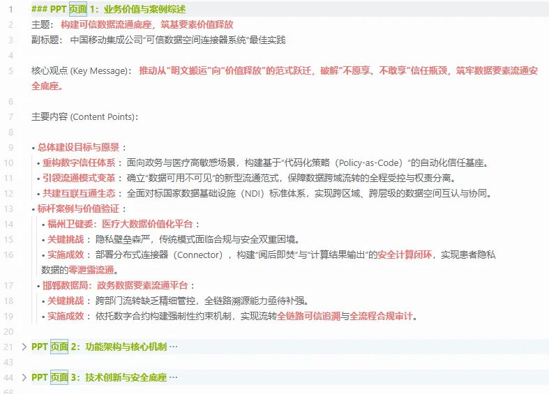 这一步就是准备内容稿。这部分网上教程很多,我就不展开了。简单说,就是把你脑子里想说的话,扔给 AI,让它帮你梳理成一页页的文字大纲。