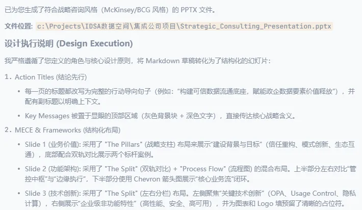 很快,我就得到了一份《战略咨询 PPT 风格指南.md》。这就是我的独家“菜谱”,以后不管做什么内容的 PPT,只要按着这个菜谱来,味道就不会差太远。