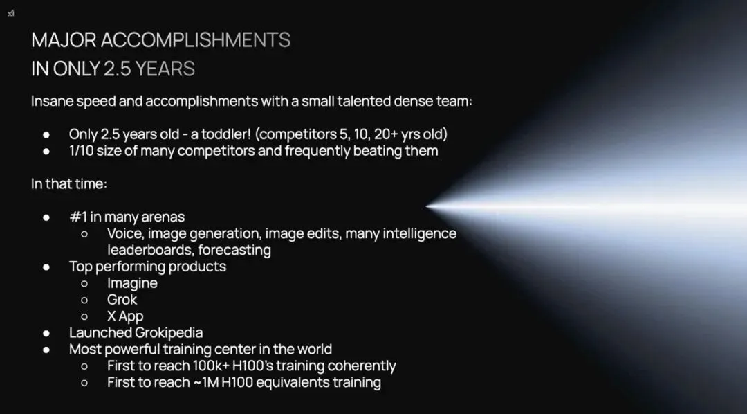 相比于那些拥有更多资源的老牌竞争对手,马斯克将xAI形容为一个“蹒跚学步的孩子”。但正是这个孩子,在短短两年半的时间里取得了令行业震颤的成就: