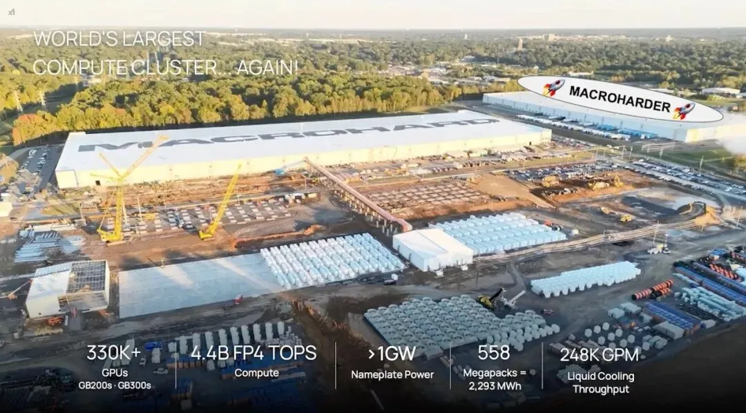这是目前世界上最大的GPU集群,拥有30万块以上的平台级GPU。单是一个大厅就铺设了847英里的光纤,容纳2.7万块GPU。xAI在不到6周的时间内就建成了这些大厅,并配备了世界上最大的特斯拉Megapack储能系统以平滑电力。这种软硬件及运营的垂直整合能力,是xAI的核心护城河。