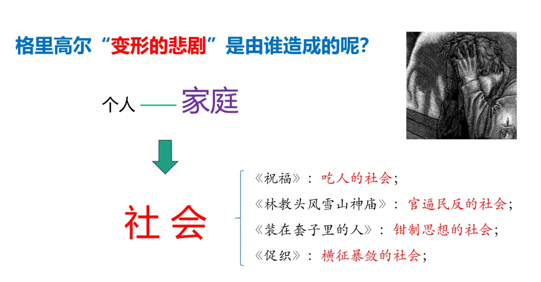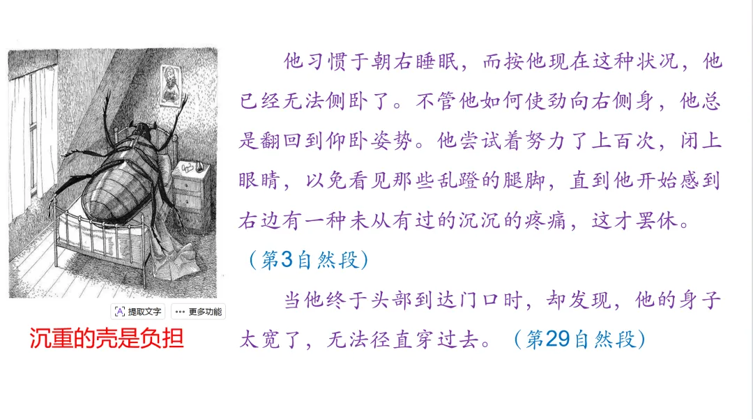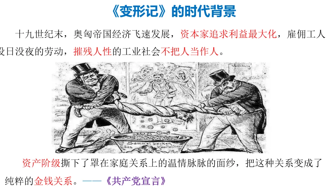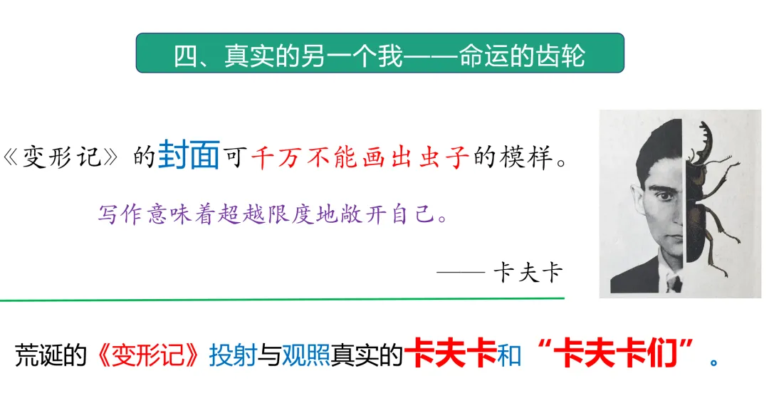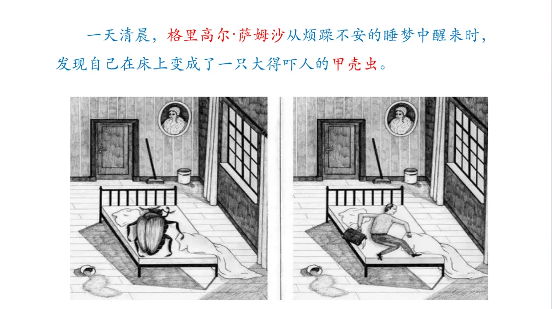 与本课前一篇小说《促织》比较,《促织》中成名的儿子幻化为虫,《变形记》的主人公格里高尔一觉醒来变成了一只甲虫。请大家思考分析其异同。