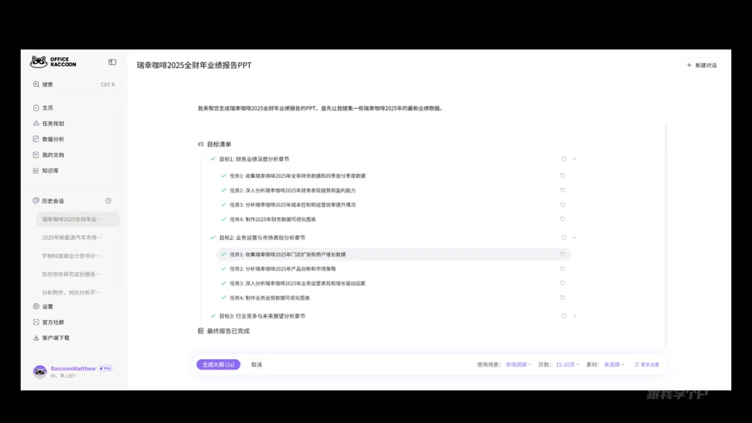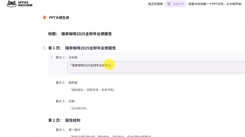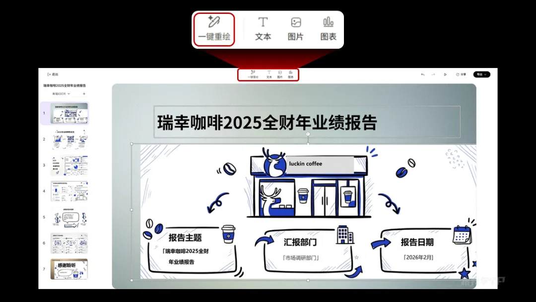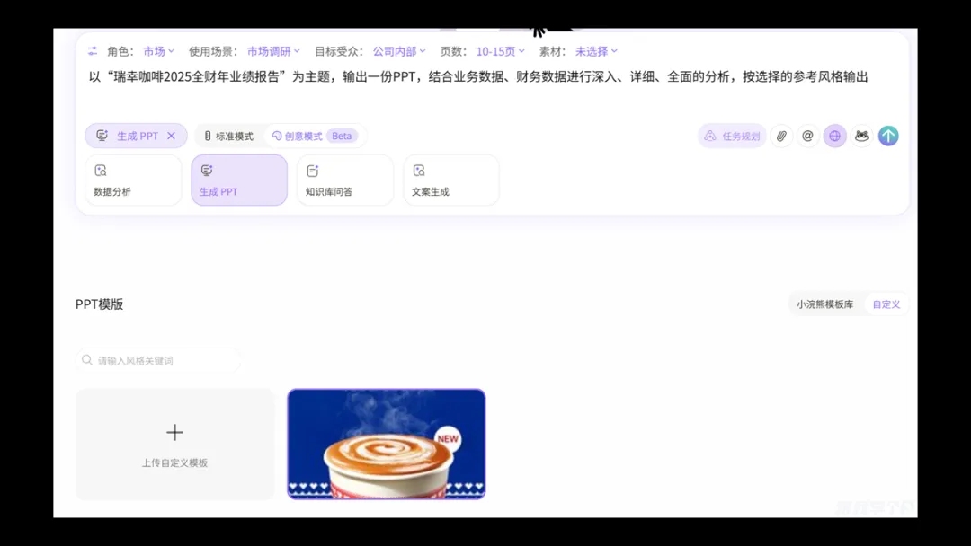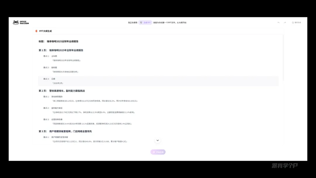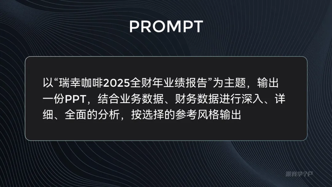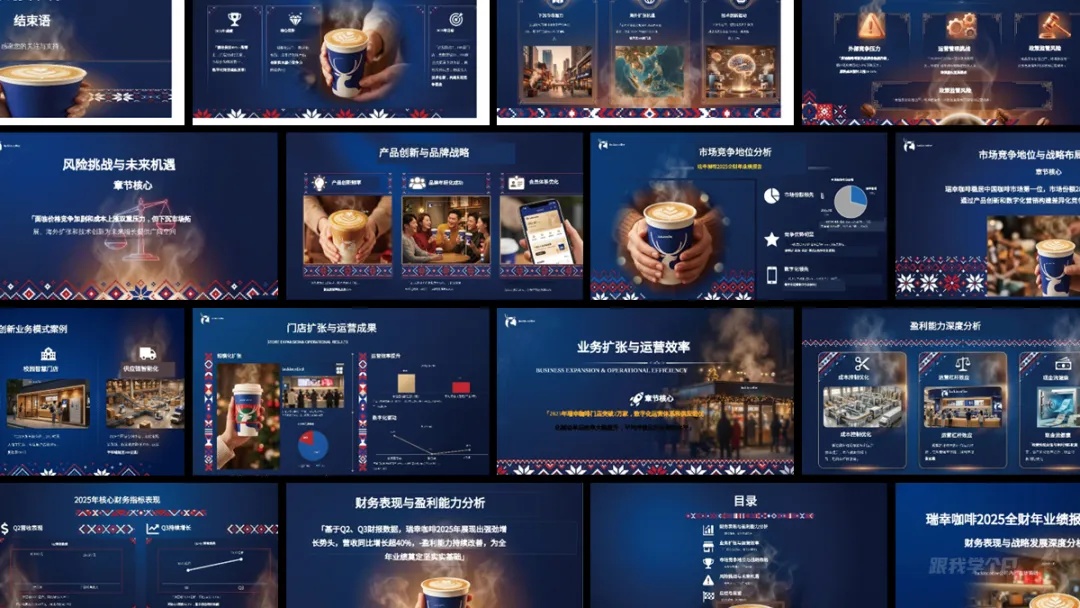 先来简单测试一下风格排版,这里我让AI帮我做一份瑞幸咖啡2025年全财年业绩报告,就简单一段提示词: