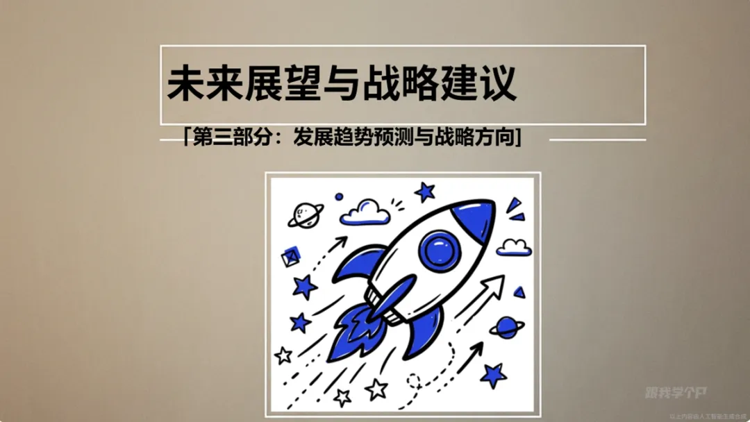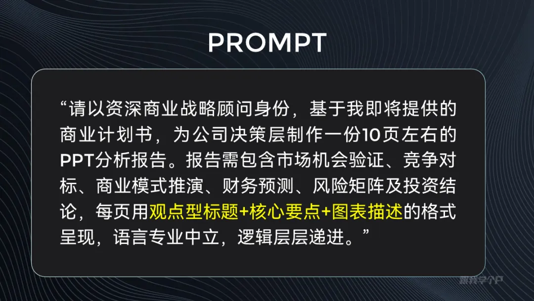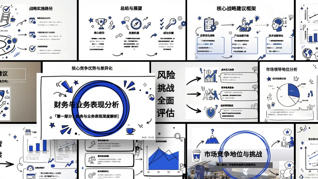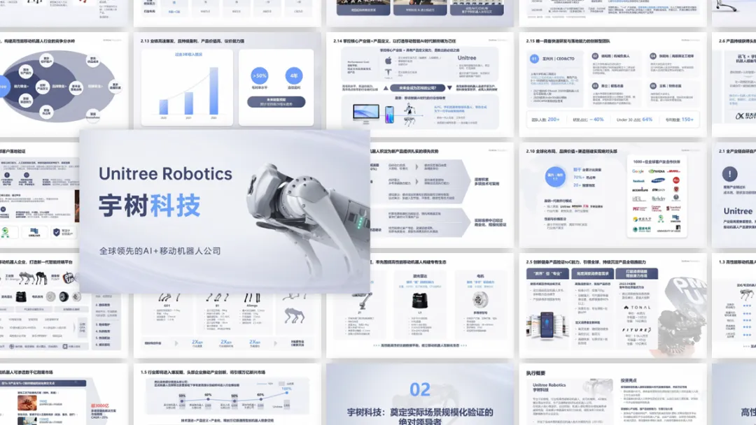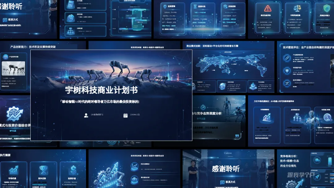 在模板库这里有个自定义选项,点击后就能上传风格参考文件:还是以前面瑞幸的案例为例,现在我想输出一份符合瑞幸官方调性风格的PPT,比如参考这张海报的风格:先忽略内容排版,风格方面是对应上了,虽然差那么一丢丢。再来看一个案例,比如宇树科技这份商业计划书,现在我是作为一个商业顾问的角色要基于这份商业计划书输出一份分析报告PPT:把这份上传文件后,将我的想法用提示词的形式告诉AI:这里的提示词尽量写清晰一些,比如你的目的,重点分析维度等等:科技企业的分析报告,这里我想用科技风,直接上传我们出品的科技风PPT手册作为风格参考:相对来说,风格还是比较接近参考素材,图片和icon的搭配也和主题相符。▎来说点不足