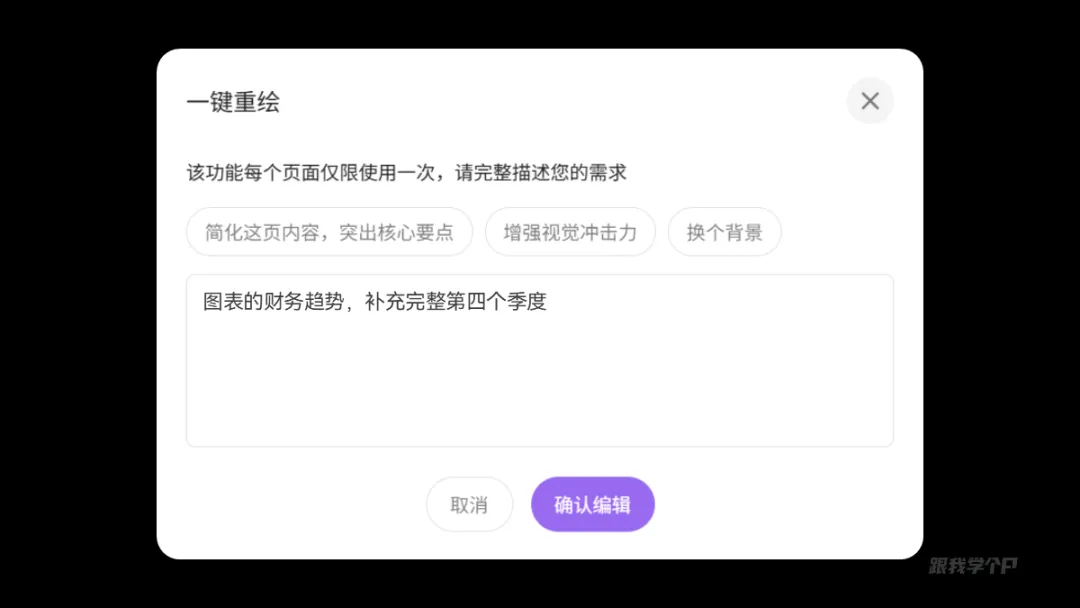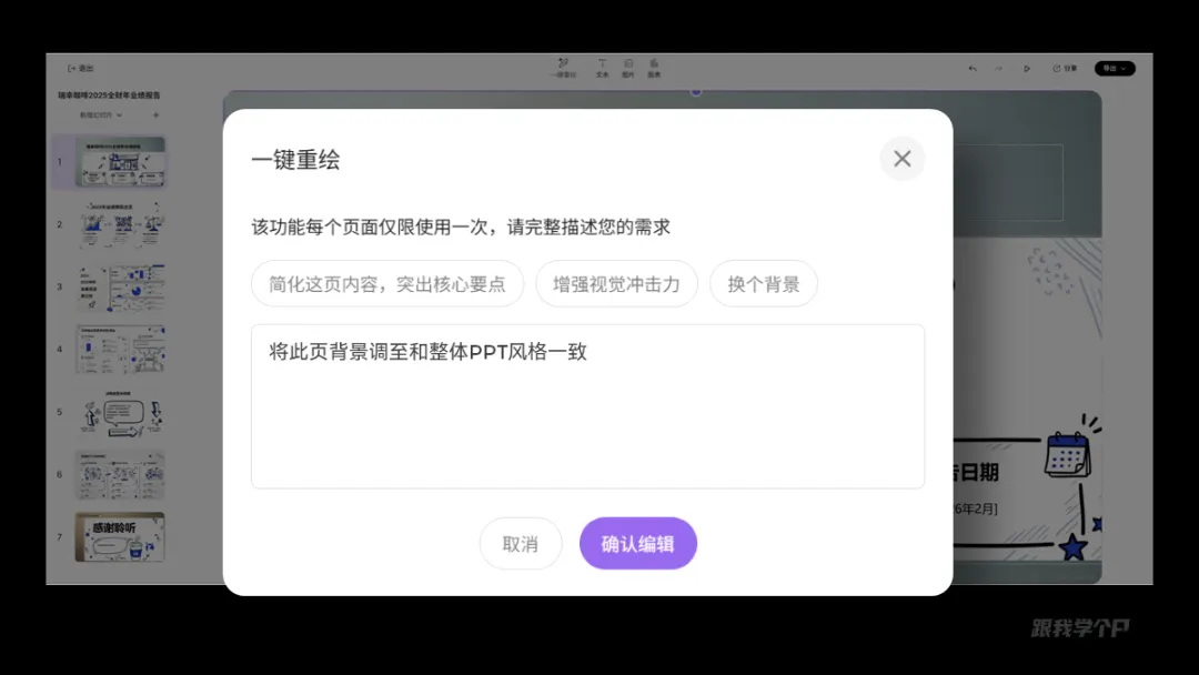 点击进去后,弹出一个窗口,这里可以输入提示词让AI帮你重绘,比如输入统一背景的提示词: