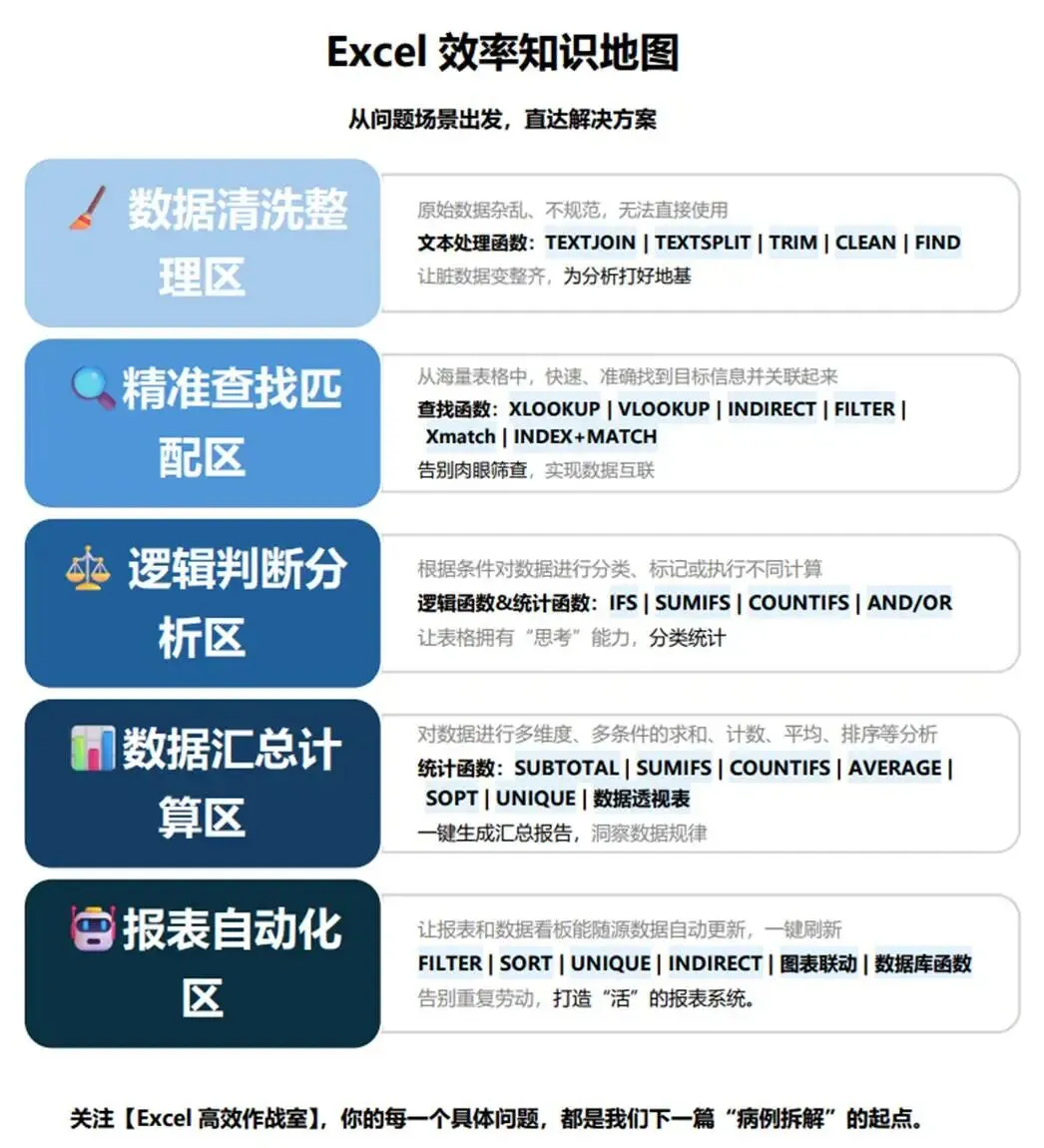 这套框架,我把它可视化成了下面这张 《Excel效率知识地图》。