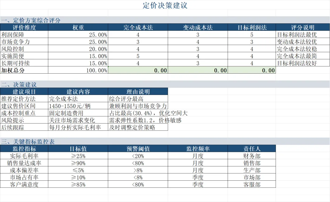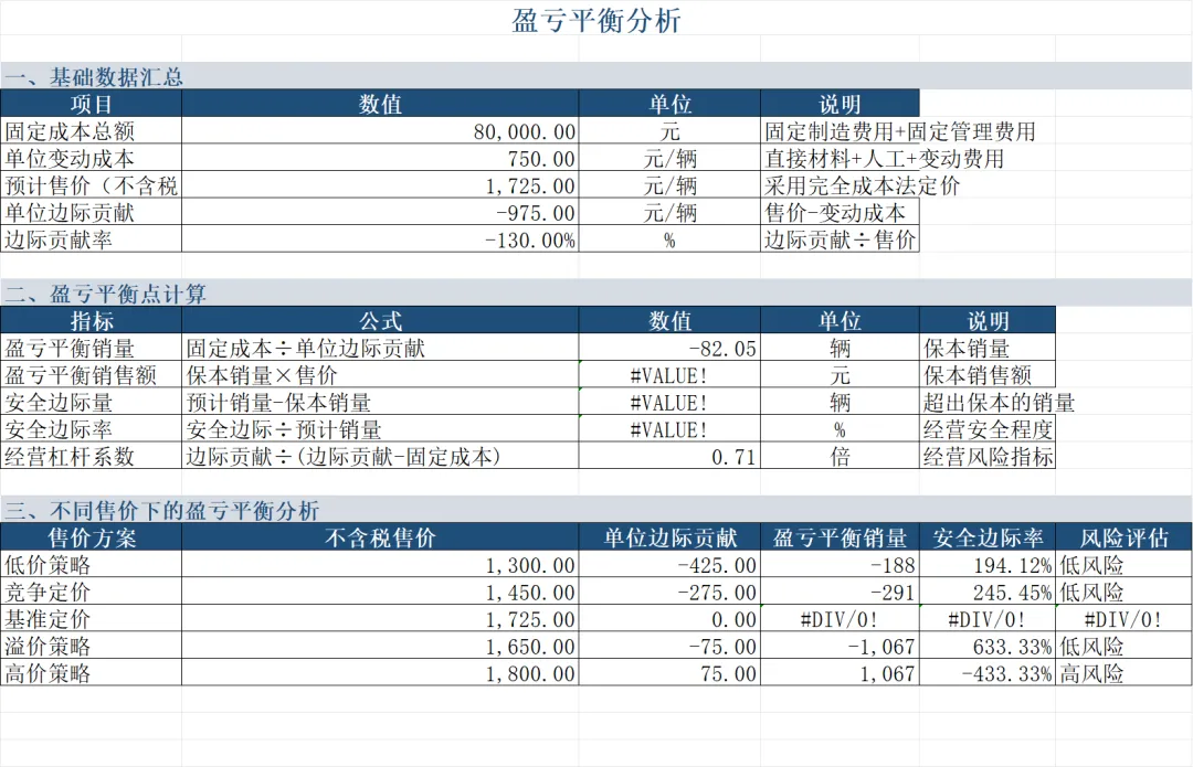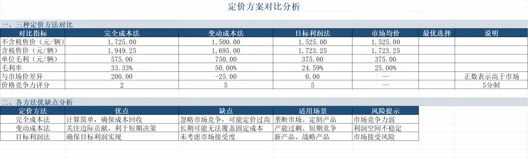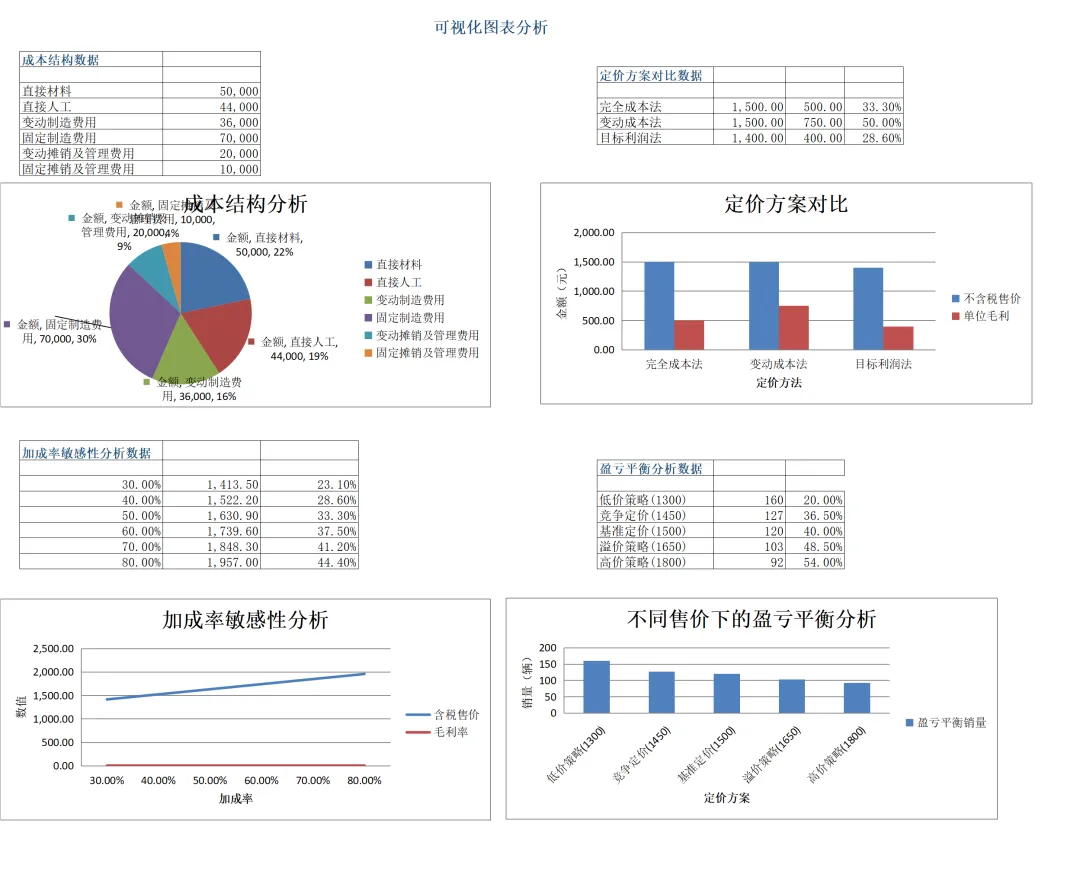 定价方案对比分析 / PRICING COMPARISON对比不同定价方案的利润、收入、市场份额等指标,找到最优定价策略。敏感性分析 / SENSITIVITY ANALYSIS分析成本、销量、价格等因素变化对利润的影响,评估方案的稳定性。盈亏平衡分析 / BREAK-EVEN ANALYSIS计算盈亏平衡点,帮助企业确定最低销售目标,降低经营风险。