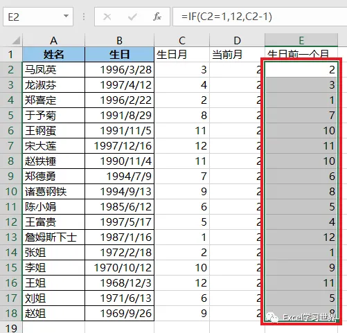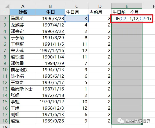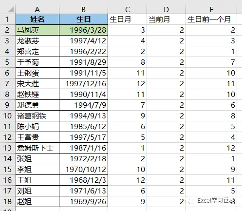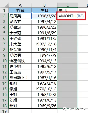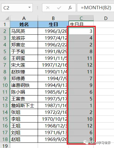 1. 在 C 列中提取出每个人的生日月份,选中 C2:C18 区域 --> 输入以下公式 --> 按 Ctrl+Enter: