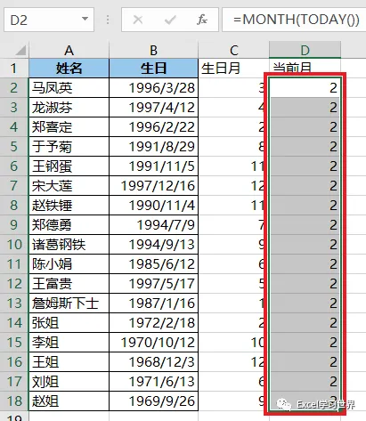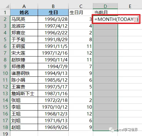 2. 选中 D2:D18 区域 --> 输入以下公式 --> 按 Ctrl+Enter,从而计算出当前日期所处的月份: