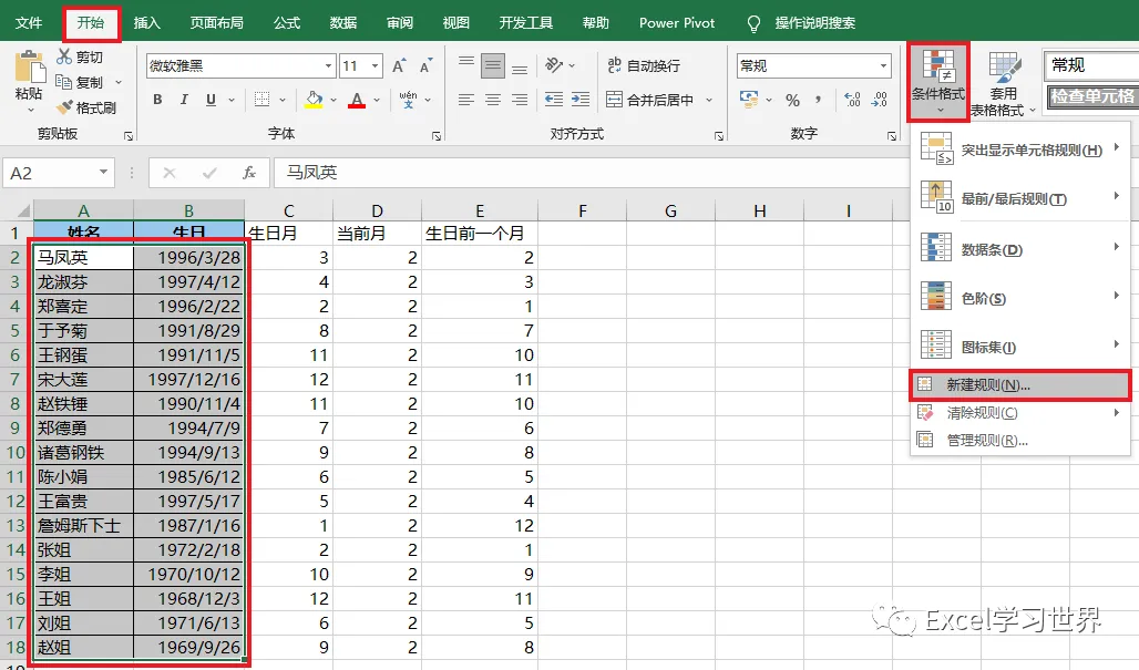 4. 选中 A2:B18 区域 --> 选择菜单栏的“开始”-->“条件格式”-->“新建规则”