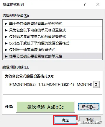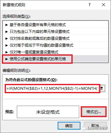 5. 在弹出的对话框中选择“使用公式确定要设置格式的单元格”--> 输入以下公式 --> 点击“格式”按钮: