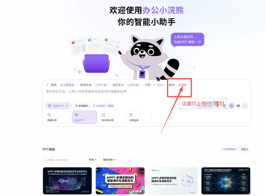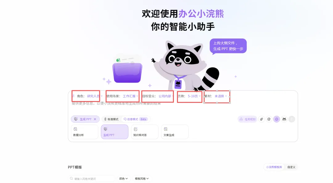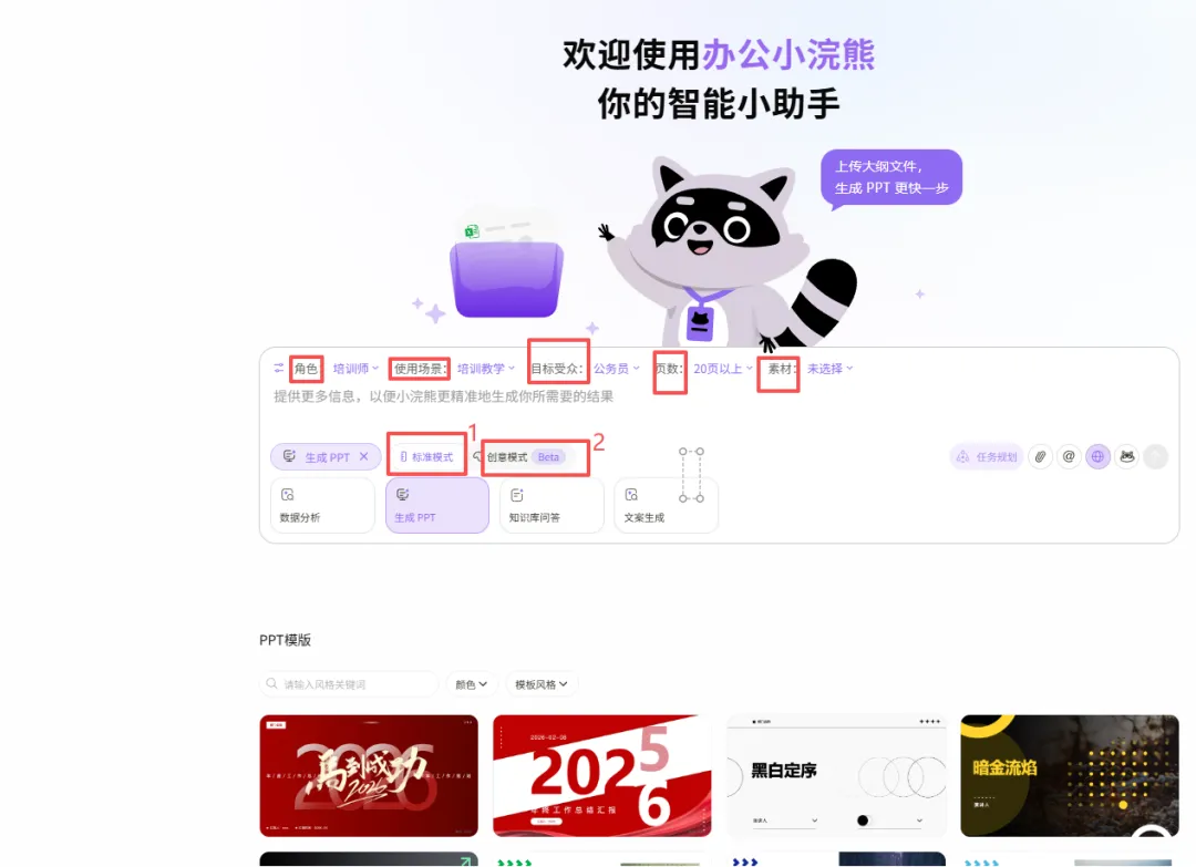 地址我贴在这里:https://office.xiaohuanxiong.com目前支持iOS 手机端、网页版、桌面端、小程序。最近,官方对Ai PPT功能进行了一波升级,实测下来,特别好用。打开上面小浣熊的网址登录之后,可以看到办公小浣熊支持的功能不少:数据分析、做PPT、知识库问答、文案写作,覆盖挺全。它现在提供两种模式,一种是标准模式(上图数字1处),另外一种就是官方最近升级的创意模式(上图数字2处)。在创意模式下,可以选择高质量的模板,点解延伸和视频风格,还可以选择不同颜色和不同主题风格的模板。
